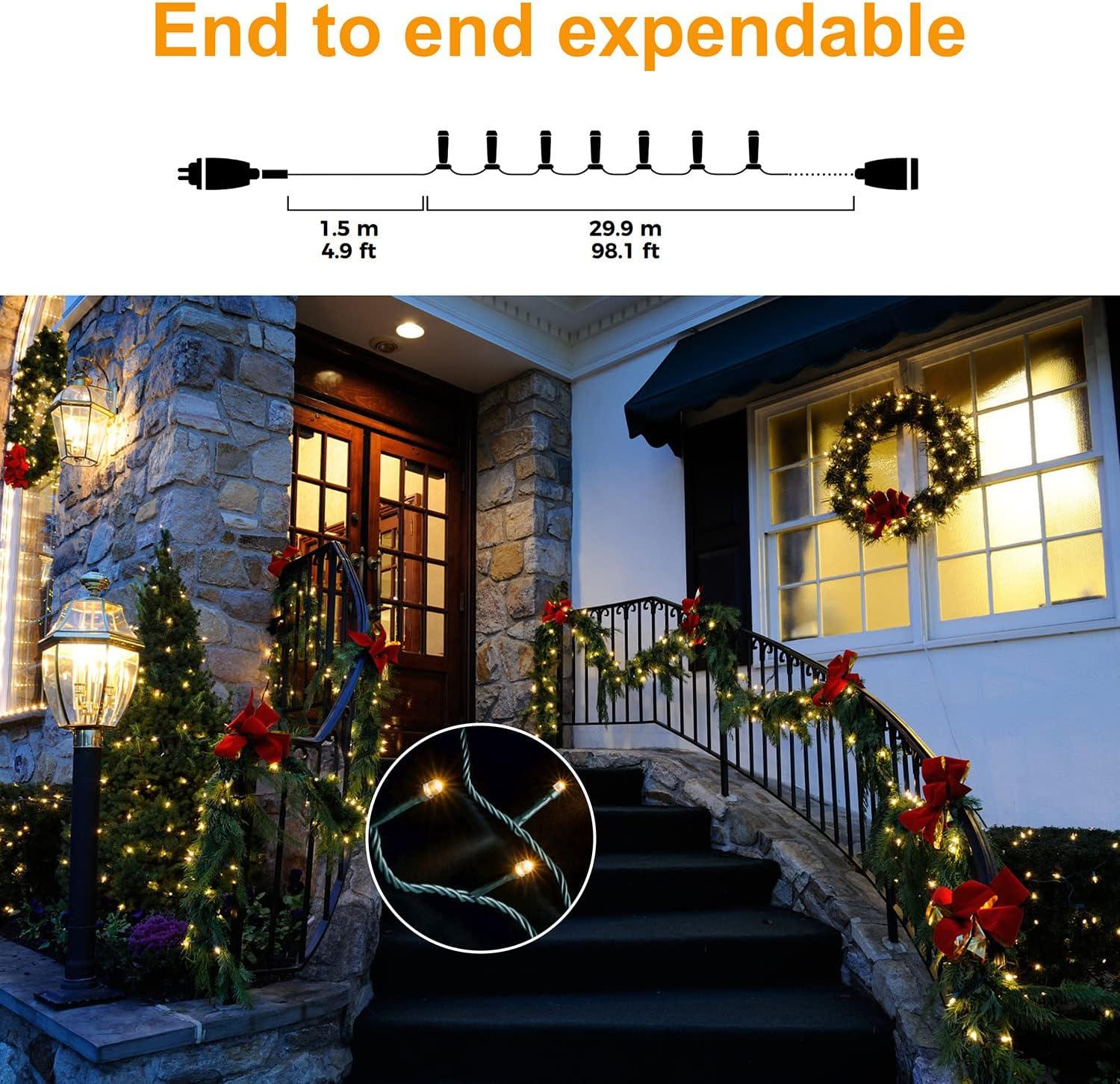 - Remote Control & End-to-End Connectable: The remote control can set different light mode and adjustable brightness, timer and turn it ON/OFF. Note: Please remove the insulation sheet before use. Upgraded christmas tree lights adapter support end-to-end linkable up to 3 sets of Christmas light strings, with a total of 900 LEDs 324 feet, which can be expanded to meet your variours decoration needs.