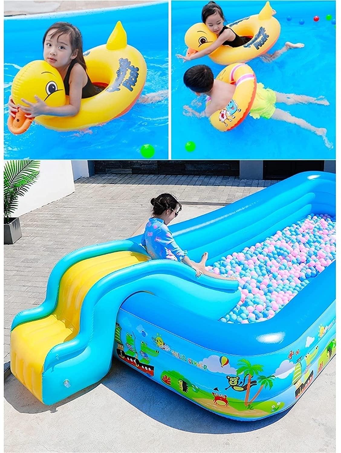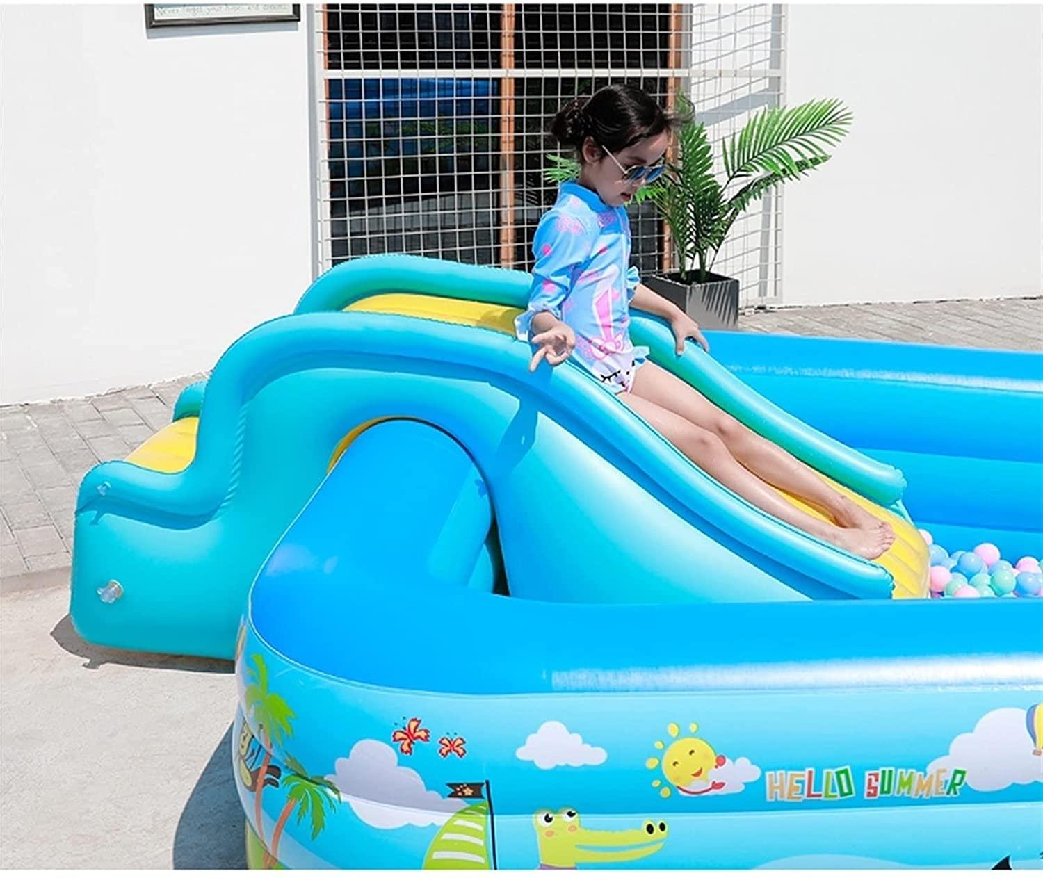 • Safety: Anti-collision rounded corner design, smooth, rounded wall. Thickened PVC material, durable, not easily damaged, and has a strong load-bearing capacity. The bottom drain pipe can be connected to an extension pipe for easy drainage. Tailor-made slides, suitable for swimming pool use, stable and tight, with handrails and steps. The contact is soft and the children’s games will be safe and joyful.