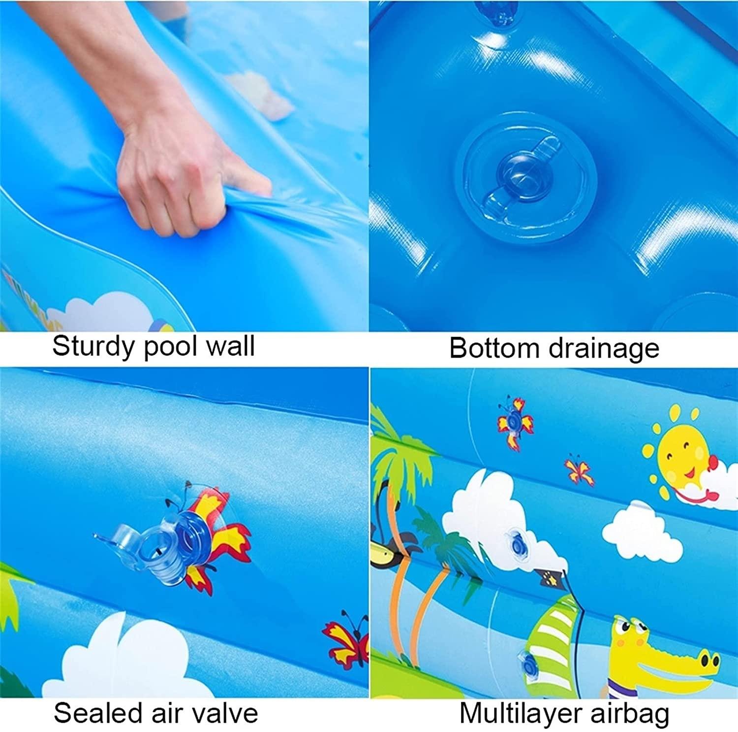 • Safety: Anti-collision rounded corner design, smooth, rounded wall. Thickened PVC material, durable, not easily damaged, and has a strong load-bearing capacity. The bottom drain pipe can be connected to an extension pipe for easy drainage. Tailor-made slides, suitable for swimming pool use, stable and tight, with handrails and steps. The contact is soft and the children’s games will be safe and joyful.