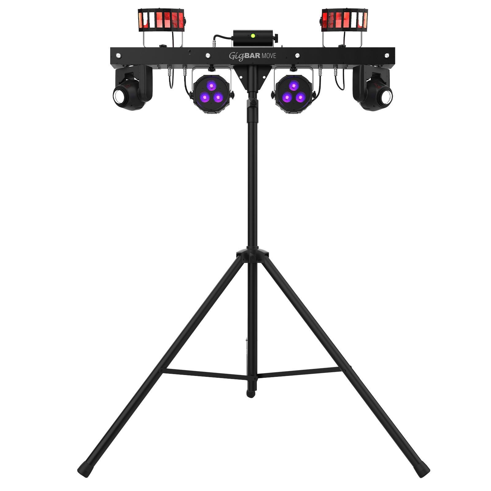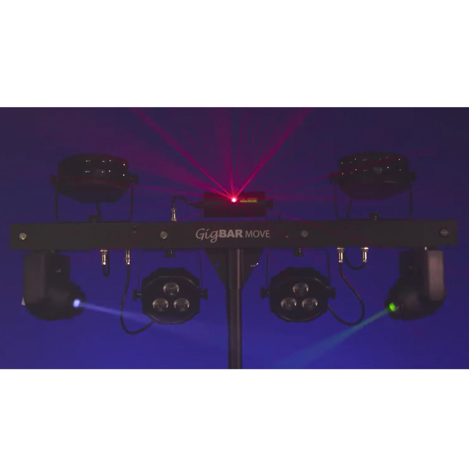 Ultimate gig lighting convenience, versatility and power is packed into GigBAR Move, a 5-in-1 lighting system that includes moving heads derbies, washes, a laser, and strobe effect pre-mounted on a single bar. That means a complete light show is available from this single system that includes a tripod, wireless foot switch, and free carry bags to ensure quick setup. The moving heads have separate color and gobo wheels to enhance creative programming possibilities, plus built-in Totem Mode to keep the moving heads focused on the dance floor. Individual control of each effect ensures your show looks the way you need it to and events can be energized with dynamic effects like built-in UV LEDs to illuminate florescent objects and make them pop. Controlling GigBAR Move is also easy. Stand-alone control, DMX, wireless IRC-6 remote, or wireless foot switch options are all on board. GigBAR Move is also compatible with GigBAR 2 in master/slave mode for huge coverage and dynamic light shows.