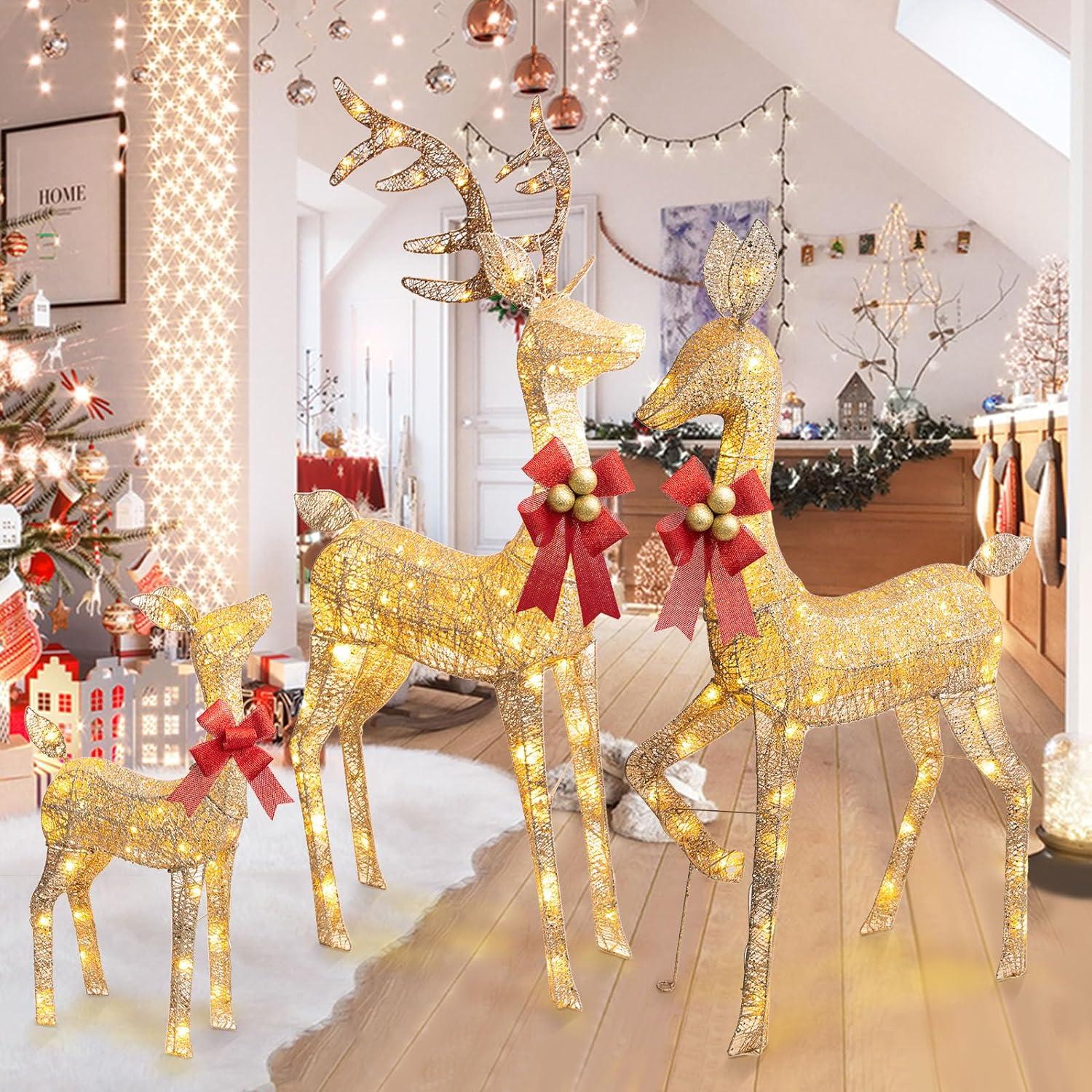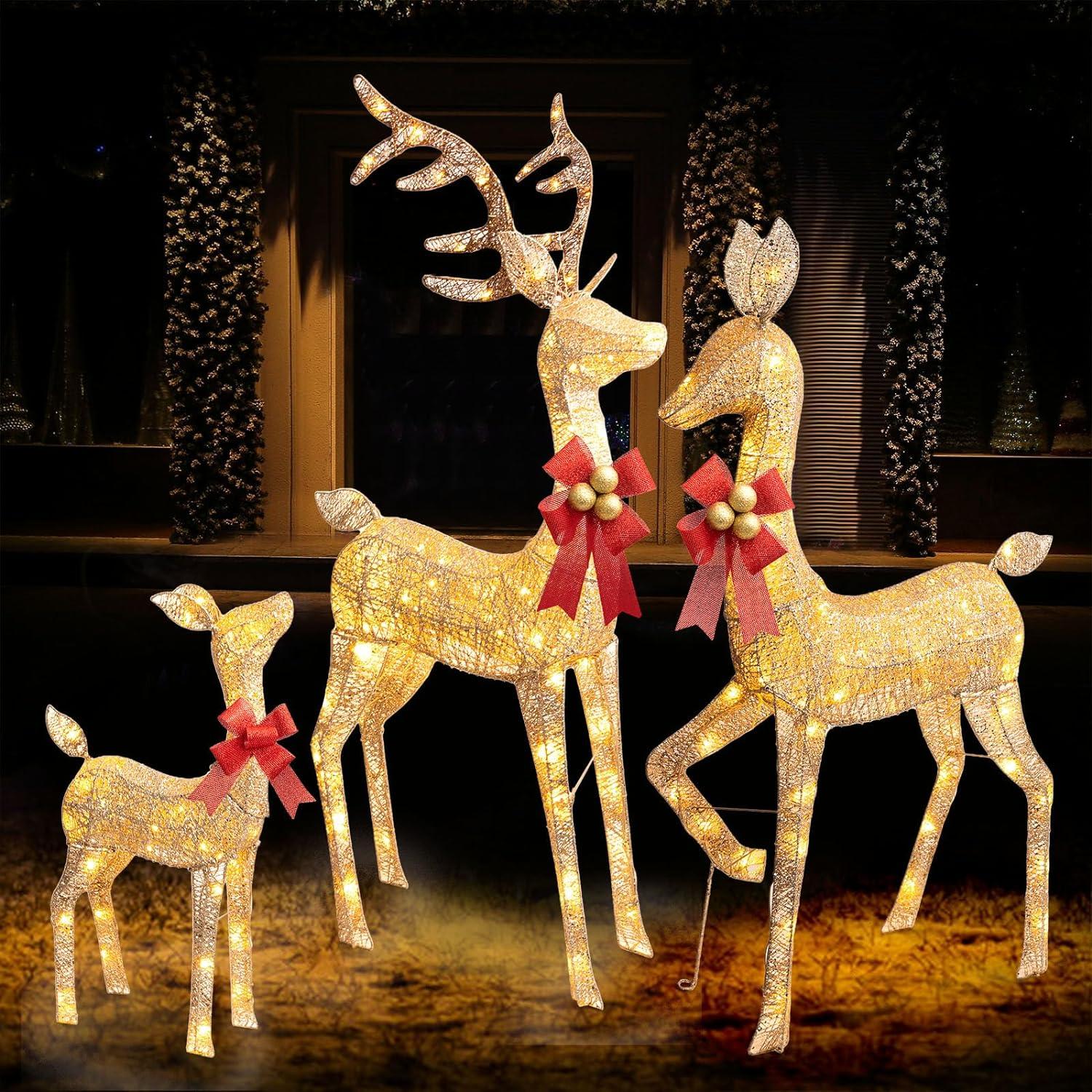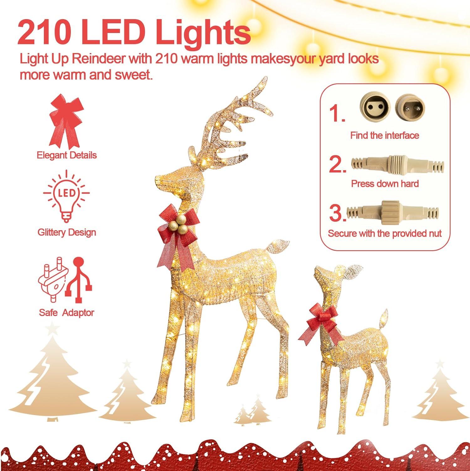 3Pcs Large Lighted Reindeer Christmas Decorations, 3D Yard Deer Decor Family Set for Indoor or Outdoor Yard Art- with 210 Warm White LED Lights,Ground Stakes,Zip Ties