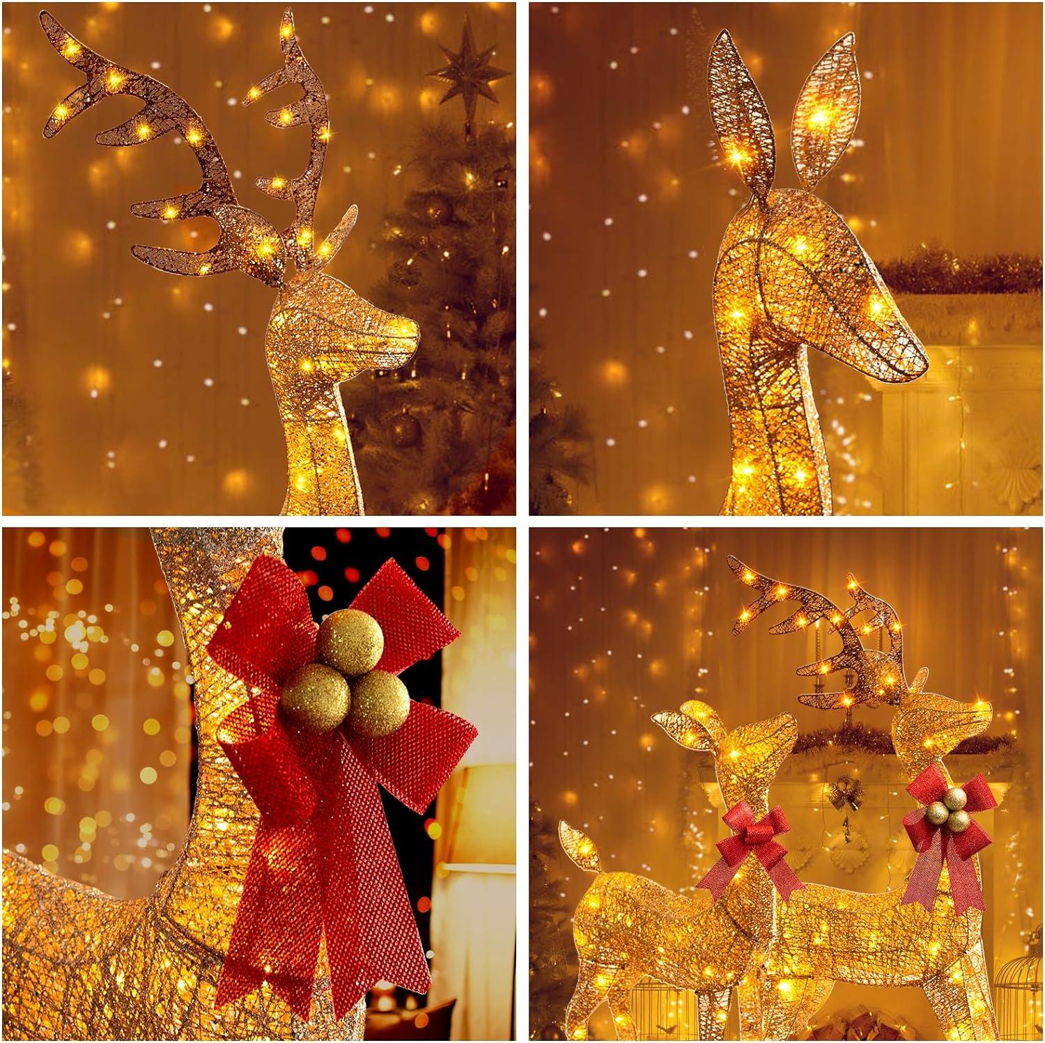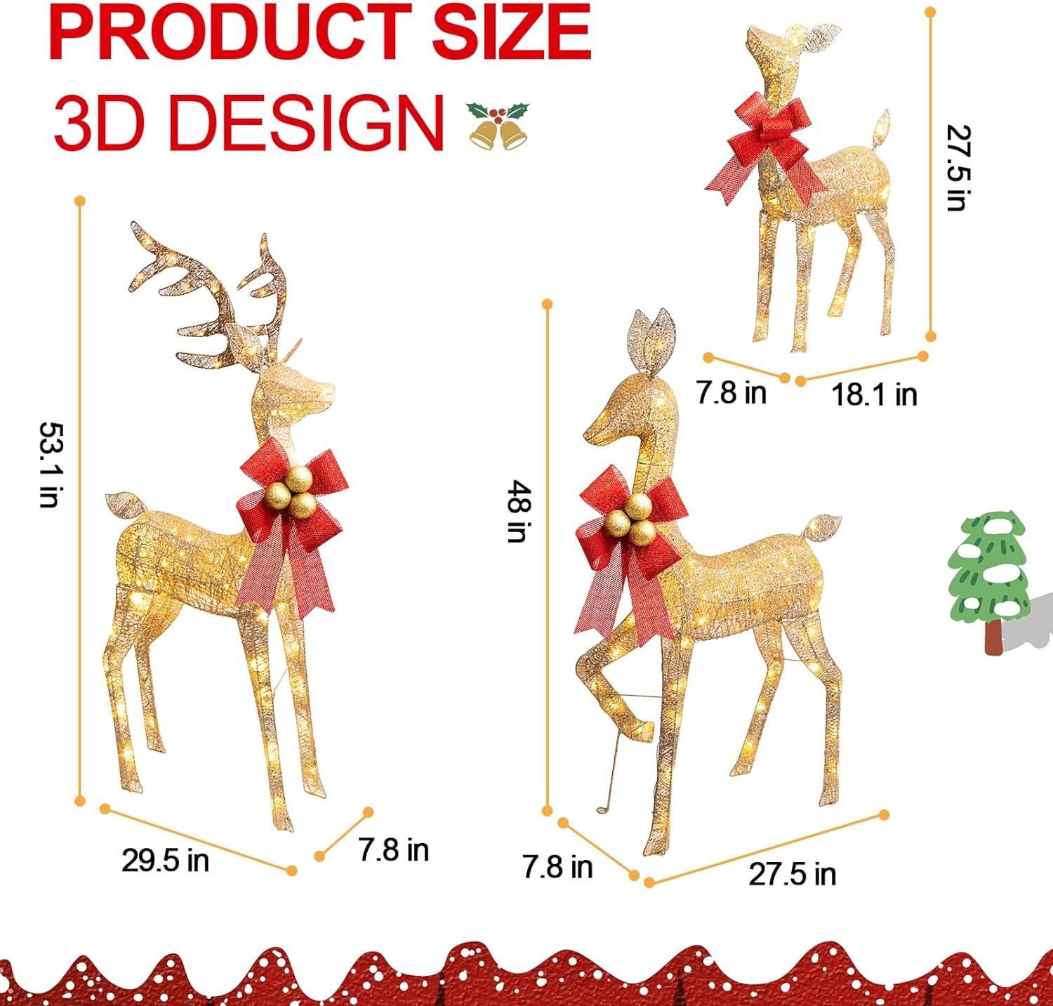 • 【Reindeer Family Set】You will receive a set of Christmas lighted reindeer family with red bows, which includes 1 buck, 1 doe and 1 fawn,The outdoor Christmas reindeer has built-in 210 LED lights.Measurments: Buck: 53”*29.5“*7.9“, Doe:48”*27.5“*7.9”, Fawn: 27.5″*18″*7.9″.