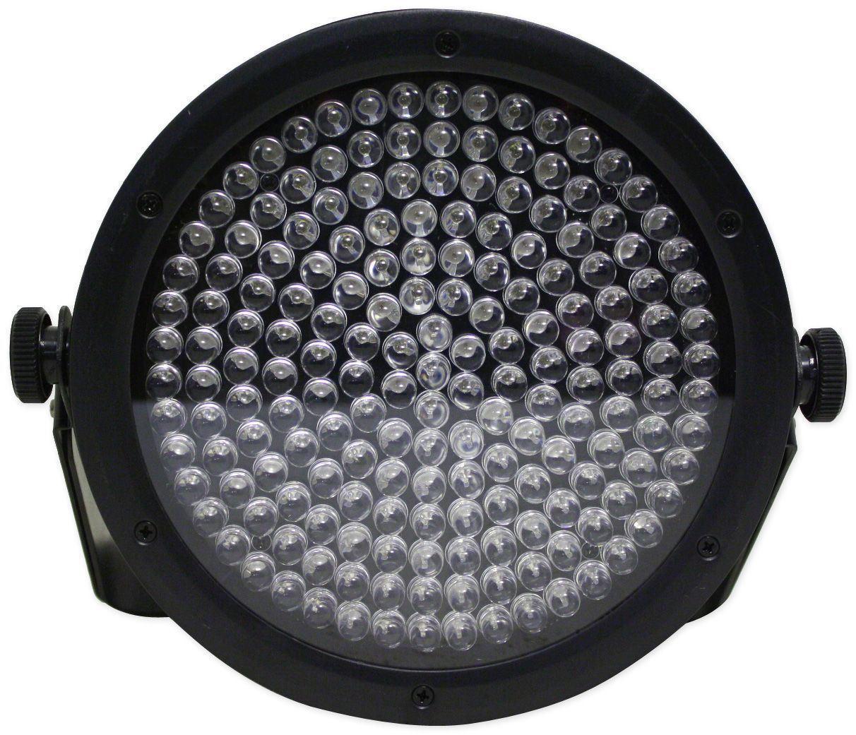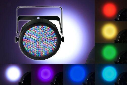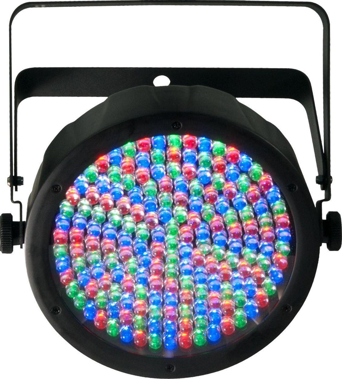 • Low-profile lights are 2.5in deep. Power linking: max 22 units @ 120V (see manual for details). Double-bracket yoke doubles as floor stand. Operating modes: 3-channel: RGB control. 7-channel: RGB, macros, run/strobe speed, automatic/sound, dimmer. Specifications: Beam angle: 23. Field angle: 38