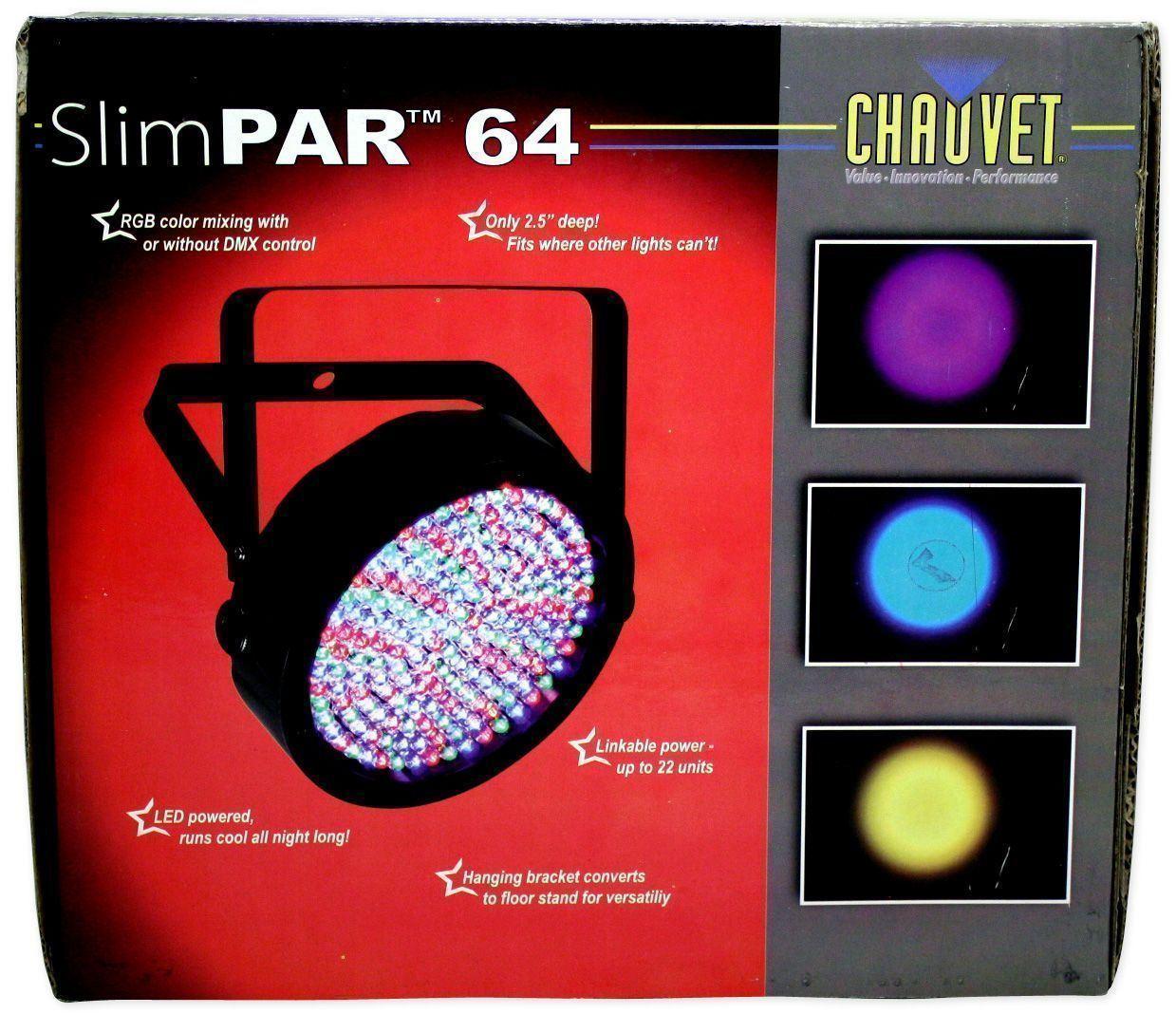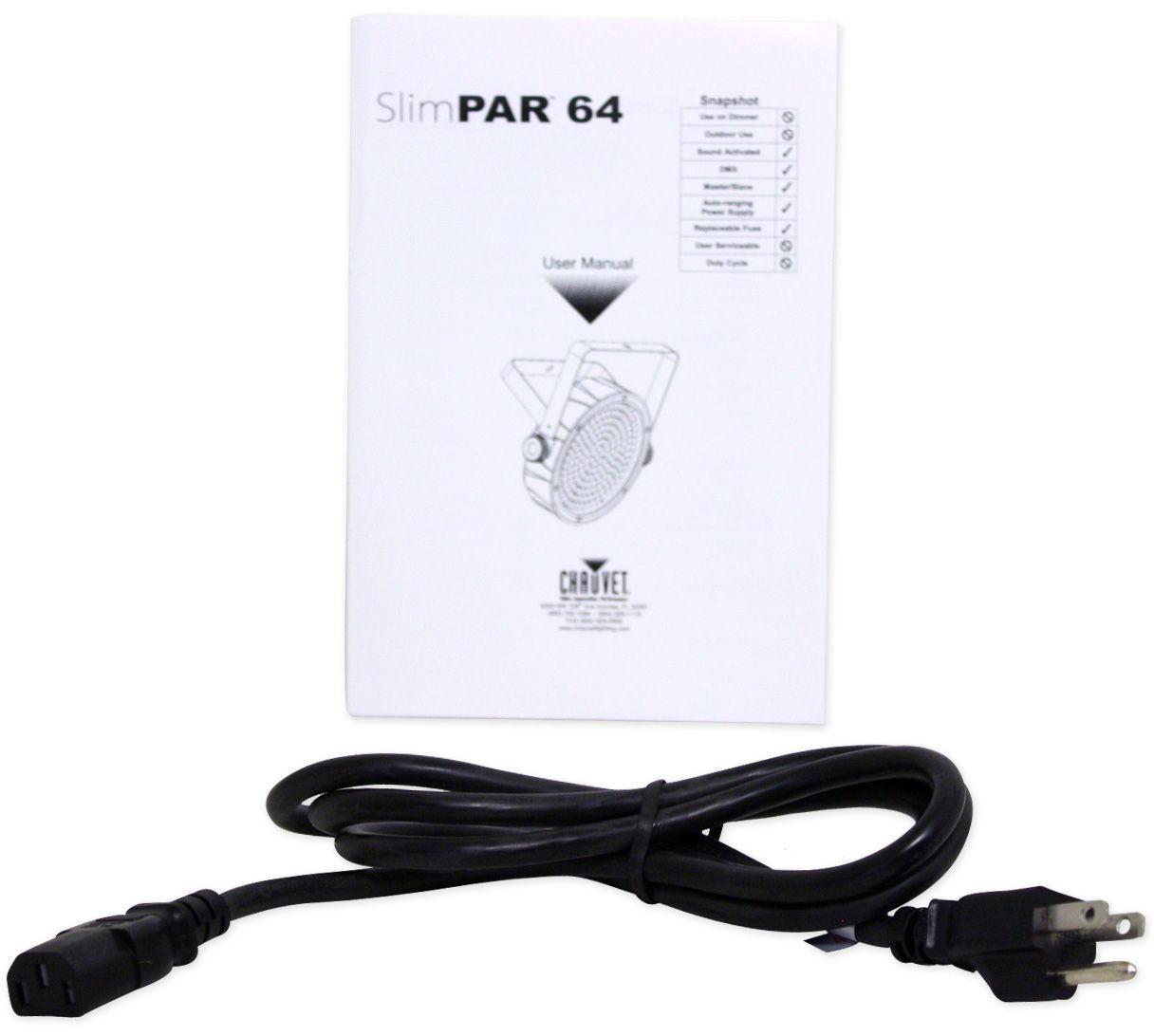 <b>Package Includes:</b><ul><li style=”text-align: left;”><span style=”font-family: Arial;”>(4) Chauvet Slimpar64 Slim Par Can Wash Light DJ Up-Light Slimpar 64</span></li><li style=”text-align: left;”><span style=”font-family: Arial;”>(1) ELIMINATOR Decor Cocktail Table Club Pub Scene Highboy w/White Scrim+Carry Bag</span></li></ul><hr><p><b>Features of Slimpar64:</b><br>3 or 7-channel DMX-512 slim LED PAR can<br>Operating modes: <br>3-channel: RGB control<br>7-channel: RGB, macros, run/strobe speed, automatic/sound, dimmer<br>Static colors and RGB color mixing with or without DMX controller<br>Built-in automated programs via master/slave or DMX with variable speed<br>Built-in sound activated programs via master/slave or DMX<br>Pulse effect with adjustable speed<br>Low-profile lights are 2.5in deep<br>Power linking: max 22 units @ 120V (see manual for details)<br>Double-bracket yoke doubles as floor stand<br><b>Specifications:</b><br>Beam angle: 23锟斤拷<br>Field angle: 38锟斤拷<br>Lux: 3,640 @ 1m<br>Light Source: 180 (60 red, 60 green, 60 blue) LEDs<br>Power and current: 120V, 60Hz: 17W, 0.3A operating, 0.2A inrush<br>AC power: Autoswitching 100V-240V 50/60Hz<br>Weight: 2.8lbs (1.3kg)<br>Size: 9.7&quot; x 11.1&quot; x 2.5&quot; inches (246mm x 282mm x 63mm)</p><p><span style=”font-family: Arial;”><a href=” target=”_blank”><span style=”color: #810081;”>Click here to view the owners manual</span></a><br>(Link opens in a new window)</span></p><hr><p><b>Specifications of Decor Cocktail Table :</b><br>Wooden Table with Heavy metal base and metal black tube<br>Assembles and dis-assembles in seconds<br>Collapses into 3 pieces (table top, center tube &amp; metal base 2-inh black tube) -No tools required&nbsp;<br>Comes in heavy duty carrying bag<br>Includes white scrim<br>37 inches tall, 23.5 Inch round top, 18 inch Metal base</p>