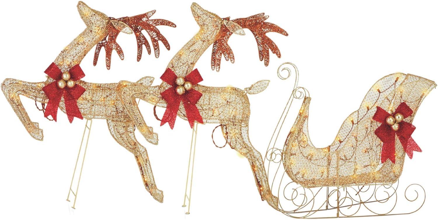 NOMA Set of 3 Pre-Lit Light Up Glittering Golden Reindeer & Sleigh | Christmas Holiday Lawn Decoration | Indoor/Outdoor