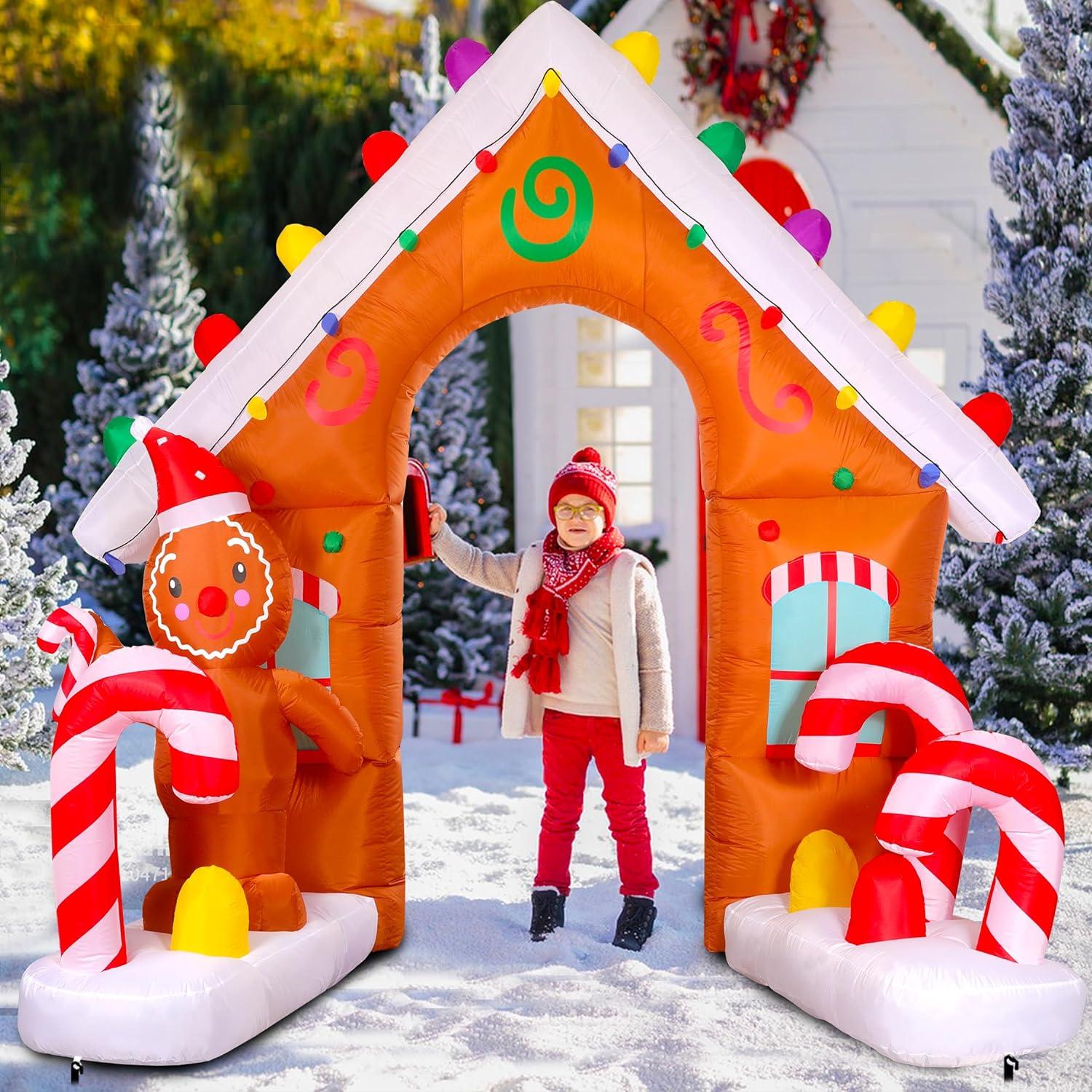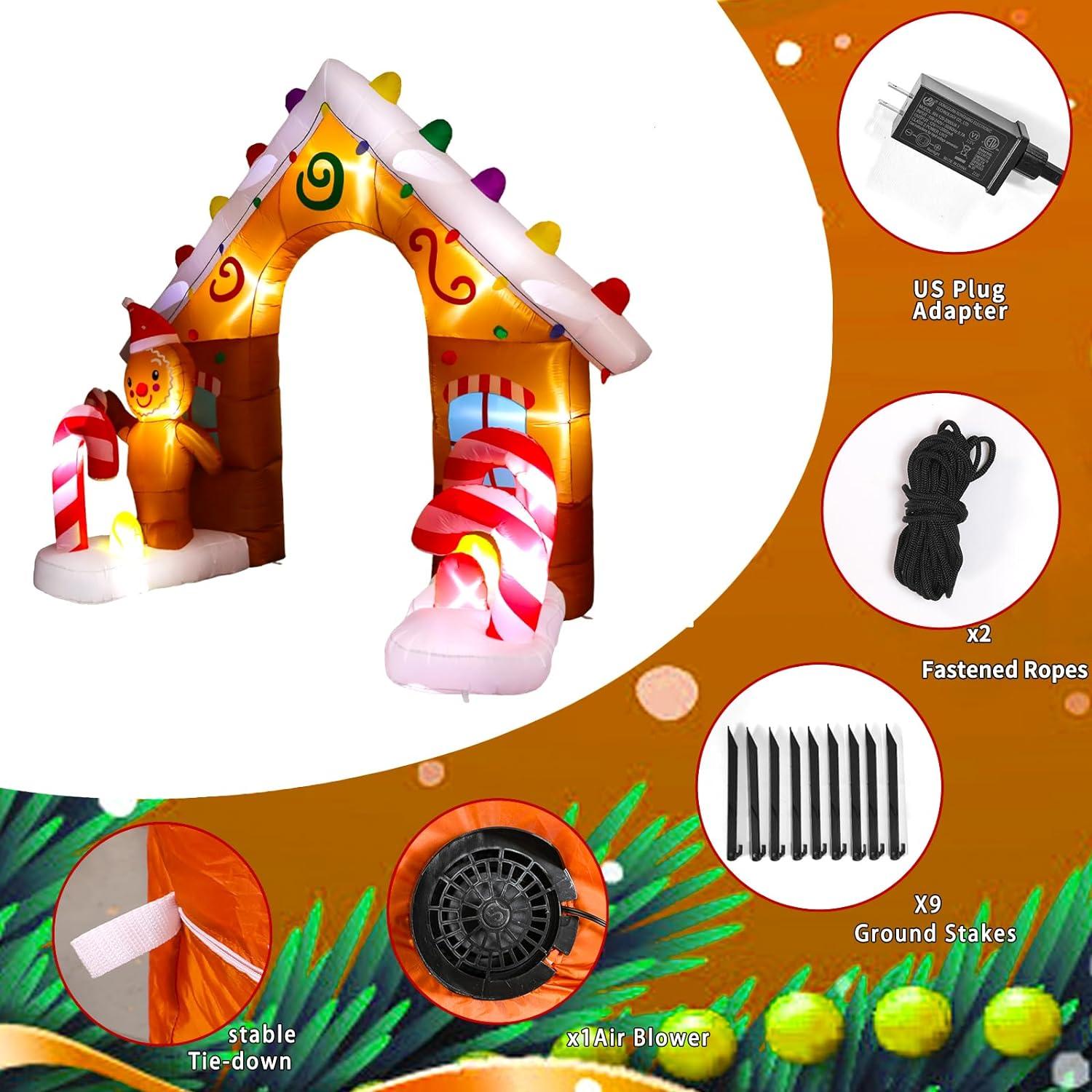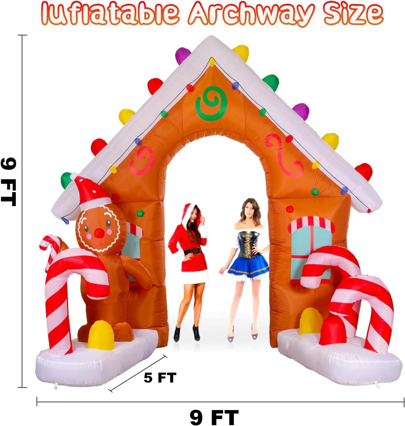 • 🍭【EYE-CATCHING CHRISTMAS DECOR】:Just plug into a standard power outlet and you’ll see an eye-catching 9ft tall Christmas inflatable arch with gingerbread Man, and candy Cane. This fun inflatable arch creates a cheerful vibe in your yard and makes your yard a welcome pit stop. Our holiday blow up yard decorations will definitely make your xmas decoration stand out!