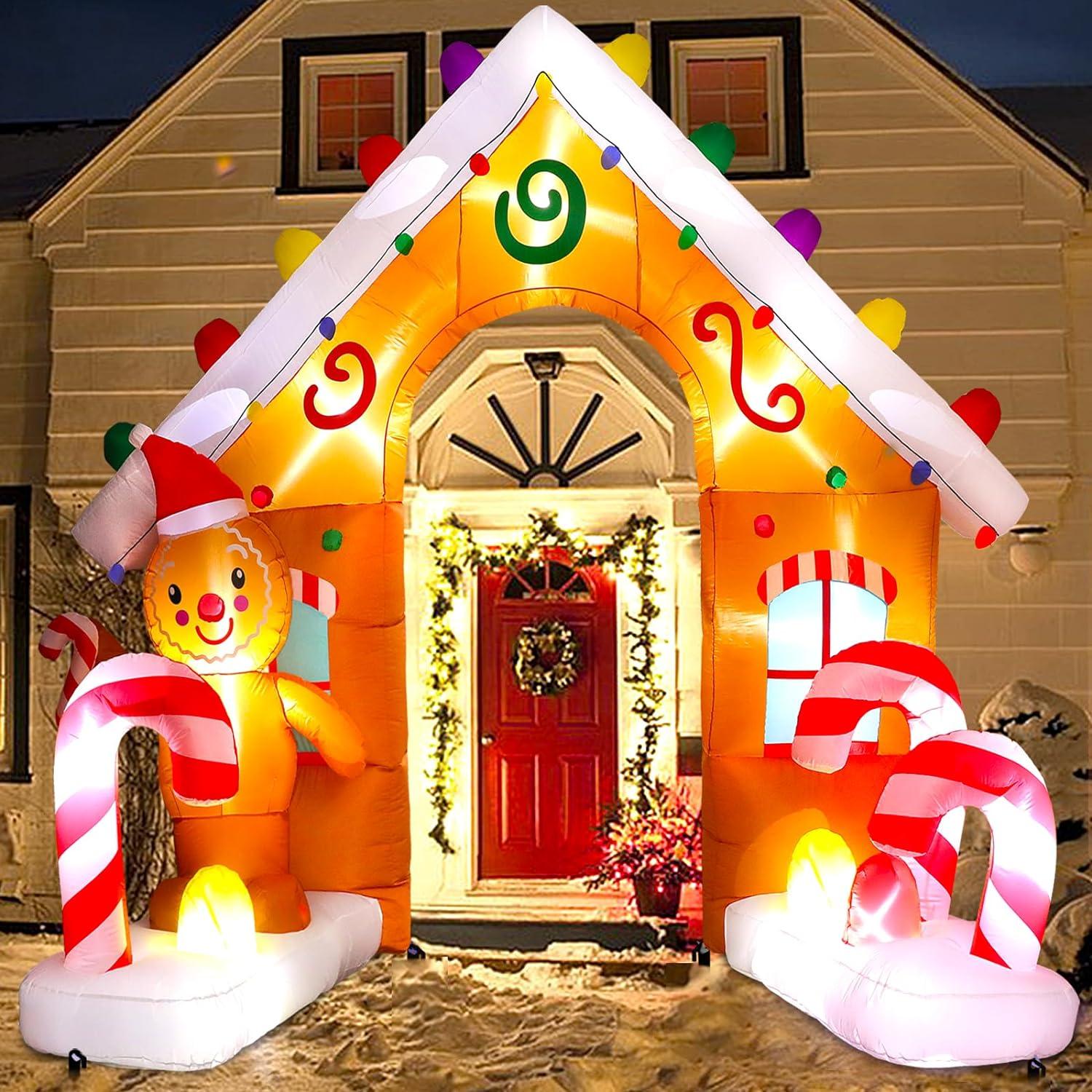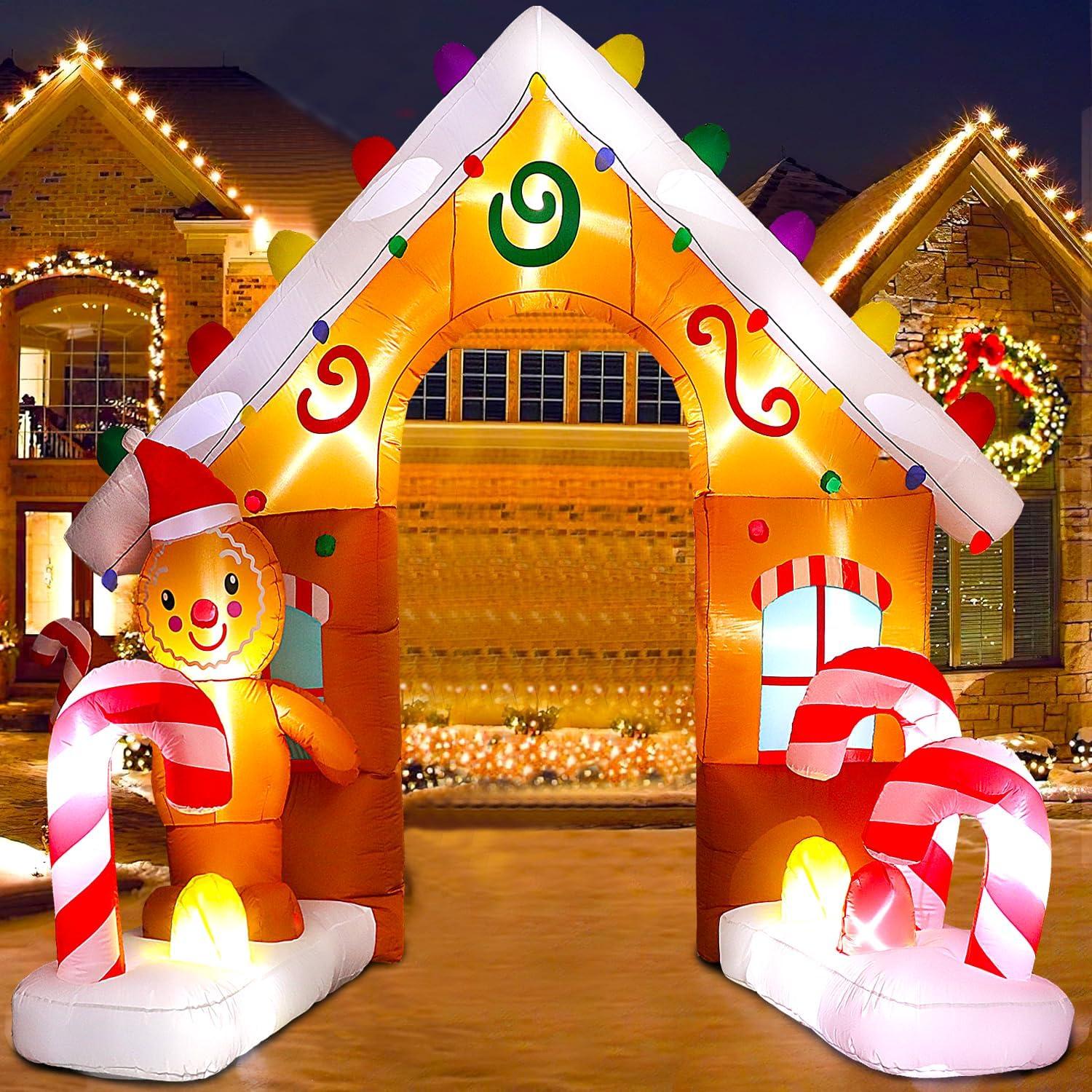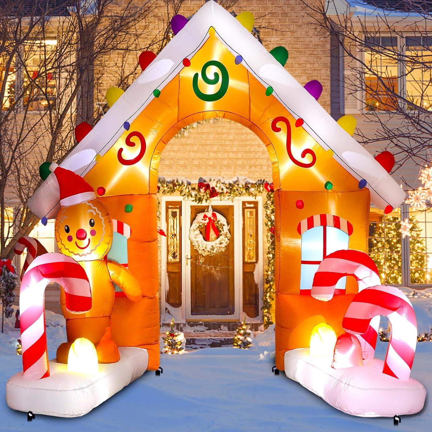 • 🍭【EYE-CATCHING CHRISTMAS DECOR】:Just plug into a standard power outlet and you’ll see an eye-catching 9ft tall Christmas inflatable arch with gingerbread Man, and candy Cane. This fun inflatable arch creates a cheerful vibe in your yard and makes your yard a welcome pit stop. Our holiday blow up yard decorations will definitely make your xmas decoration stand out!