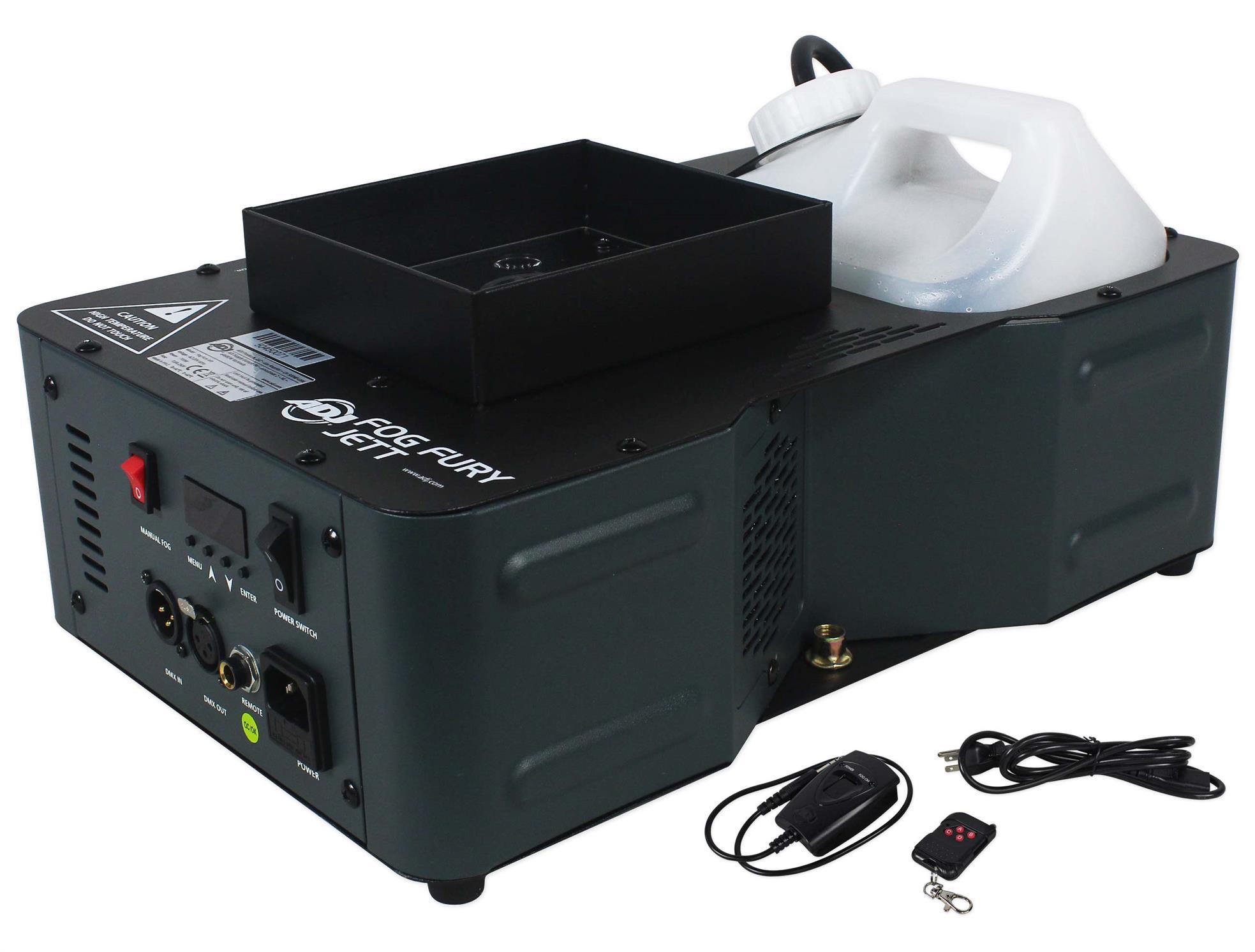 - Package Includes: (1) American DJ Fog Fury Jett 700W Vertical Fog Machine w/12 LED+DMX+Wireless Remote. (1) Rockville BATTERY PAR 50 Rechargeable LED DMX DJ Club Wash Up-Light w/ Remote. Features: American DJ Fog Fury Jett 700W Vertical Fog Machine w/12 LED+DMX+Wireless Remote. 700W professional DMX vertical Fog Machine with 12x 3-Watt LEDs. High performance pump for optimum output. ADJs Electronic Thermo Sensing (ETS) technology