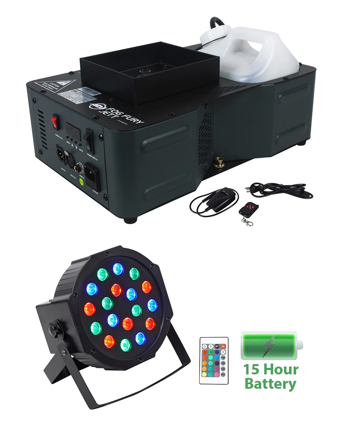 <strong>Package Includes:</strong><ul>(1) American DJ Fog Fury Jett 700W Vertical Fog Machine w/12 LED+DMX+Wireless Remote</li>(1) Rockville BATTERY PAR 50 Rechargeable LED DMX DJ Club Wash Up-Light w/ Remote</li></ul><p><strong>Features of Fog Fury Jett:</strong></p><ul><li>American DJ Fog Fury Jett 700W Vertical Fog Machine w/12 LED+DMX+Wireless Remote</li><li>700W professional DMX vertical Fog Machine with 12x 3-Watt LEDs<br></li><li>High performance pump for optimum output<br></li><li>ADJ锟斤拷s Electronic Thermo Sensing (ETS) technology<br></li><li>Special heating element design that uses an oil type transmission pipeline system to minimize the possibility clogging<br></li><li>3 Operational modes: Manual, Remote Control, or DMX Controlled<br></li><li>5 DMX Channels, 1, 2, 3 5 or 7 ch<br></li><li>4-button control panel & LCD display on rear panel<br></li><li>3-pin DMX XLR In/Out connections<br></li><li>Convenient carrying handle<br></li><li>Low Fluid Indicator on rear<br></li><li>Warm-up time: 9 min<br></li><li>External fog fluid tank: 3 Liter<br></li><li>Fog Output: 20,000 (cu.ft/min)<br></li><li>Tank can be mounted to either front or rear so that the effect may be pointed up or down<br></li><li>Included Accessory: ADJ FFJWR – wireless remote<br></li><li>Power Connection: IEC AC In<br></li><li>Safety Loop on board <br></li><li>Only use high quality, water-based fog fluid<br></li><li>Light Source: 12x 3-Watt LEDs, (3 Red, 3 Green, 3 Blue & 3 Amber LEDs) <br></li><li>Heater: 700W<br></li><li>Voltage: AC 120V, 230 or 240 50/60Hz (non switching)<br></li><li>Power Consumption: 730W (Full on)<br></li><li>Dimensions (LxWxH): 15.5锟斤拷 x 12锟斤拷 x 7.5锟斤拷 / 397 x 302 x 191mm<br></li><li>Weight: 16 lbs. / 7.1 kg.<br></li></ul><br><strong>Includes:</strong></p><ul><li>Par Light </li><li>Remote </li><li>Dual bracket </li><li>Adapter </li><li>User manual & warranty card</li></ul><p><strong>Features of BATTERY PAR 50:</strong></p><ul><li>Rockville BATTERY PAR 50 Rechargeable LED DMX DJ Club Wash Up-Light w/ Remote</li><li>Rockville BATTERY PAR 50 RGB Rechargeable Lithium Battery Powered Wash Light </li><li>Built in 4400mA lithium rechargeable battery allows you to use the lights without plugging them in</li><li>Battery lasts 15 hours with a single color and 10 hours with all colors</li><li>Charging time: 5 hours (max) </li><li>Battery overcharge protection</li><li>Battery life LED indicator</li><li>Light source: (6x Red, 6x Green, 6xBlue)</li><li>18 LEDs / 1W each</li><li>DMX controls: 7 channels </li><li>Linkable in master/slave mode using 3-Pin DMX cable</li><li>3 Pin XLR DMX input & output </li><li>Remote control included</li><li>1,102 Lux @ 2m (All LED锟斤拷s on) </li><li>LED display to navigate settings</li><li>Can be operated through the remote, through DMX, or you can use the built in programs or the built in sound activated mode </li><li>Automatic mod