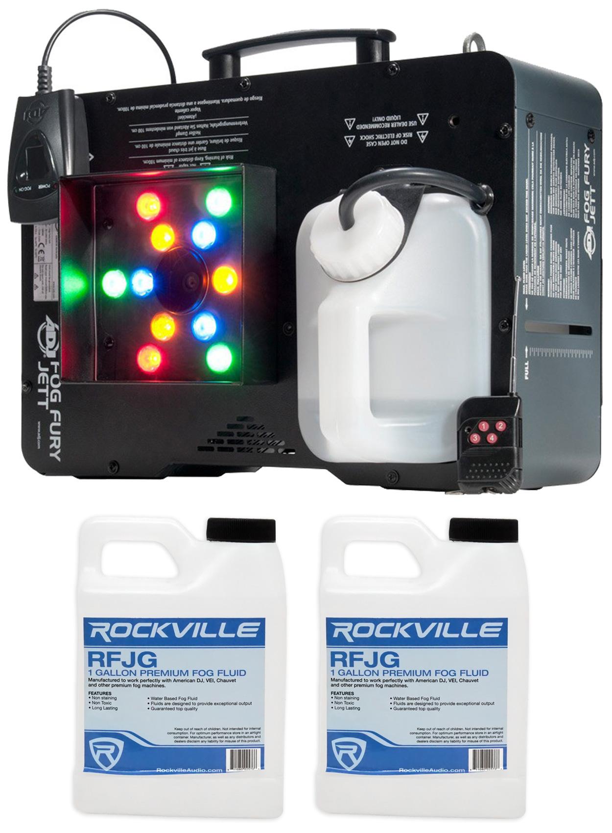 Package: American DJ Fog Fury Jett 700 Watt Vertical Fog Machine w/12 LED, 3 Modes, DMX and Wireless Remote + (2) Rockville RFJG Gallon Fog/Smoke Juice Fluids