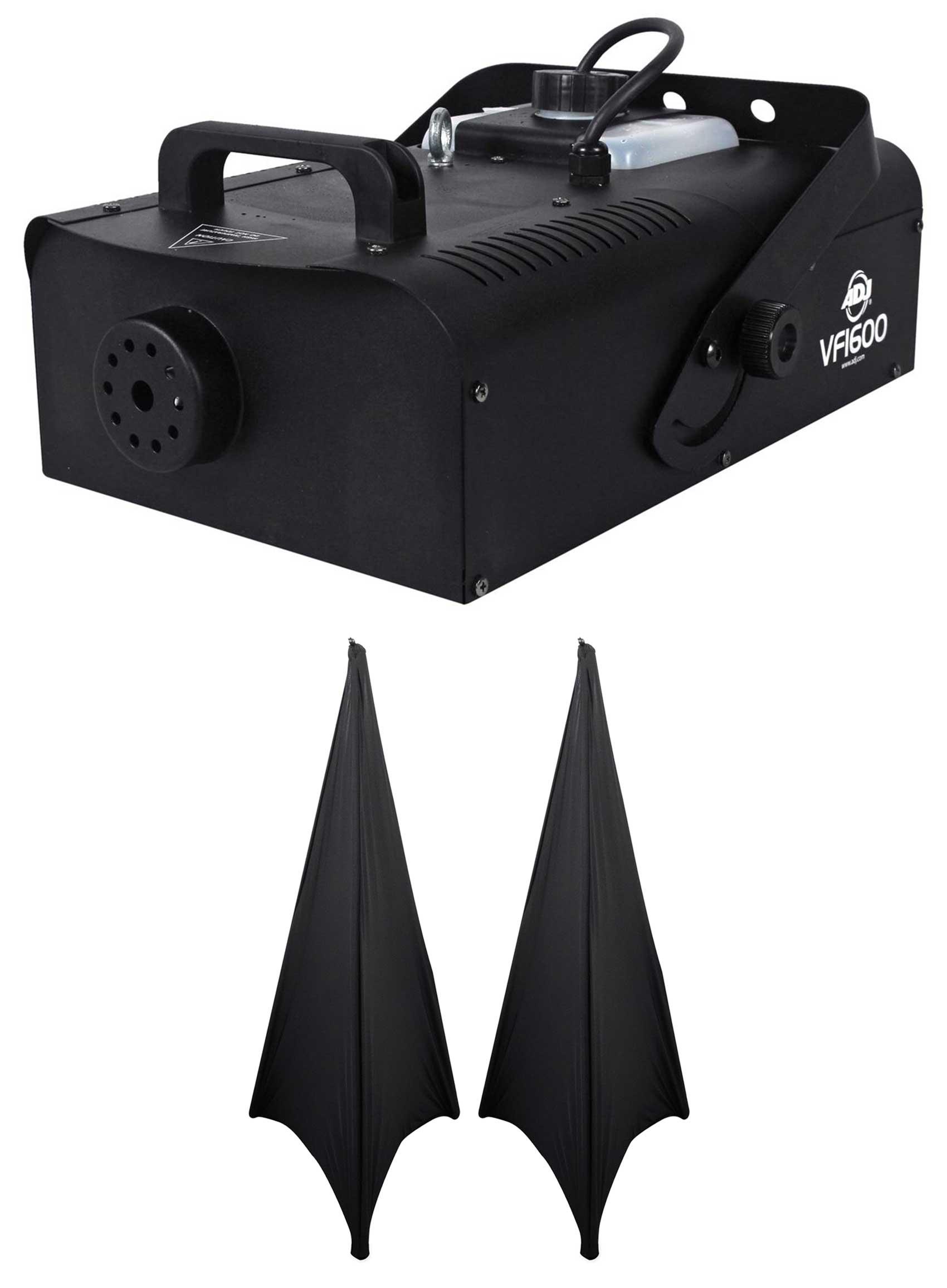 Package: American DJ VF1600 1500 Watt Portable Fog Machine with Wired + Wireless Remote Control and High Efficiency Heater Block for Decreased Residue + (2) Rockville RSC7B Black Scrim Cloth For Tripod PA Speaker Stands With 360 Degree Cover, Wrinkle Resistant Material, and Carry Pouch