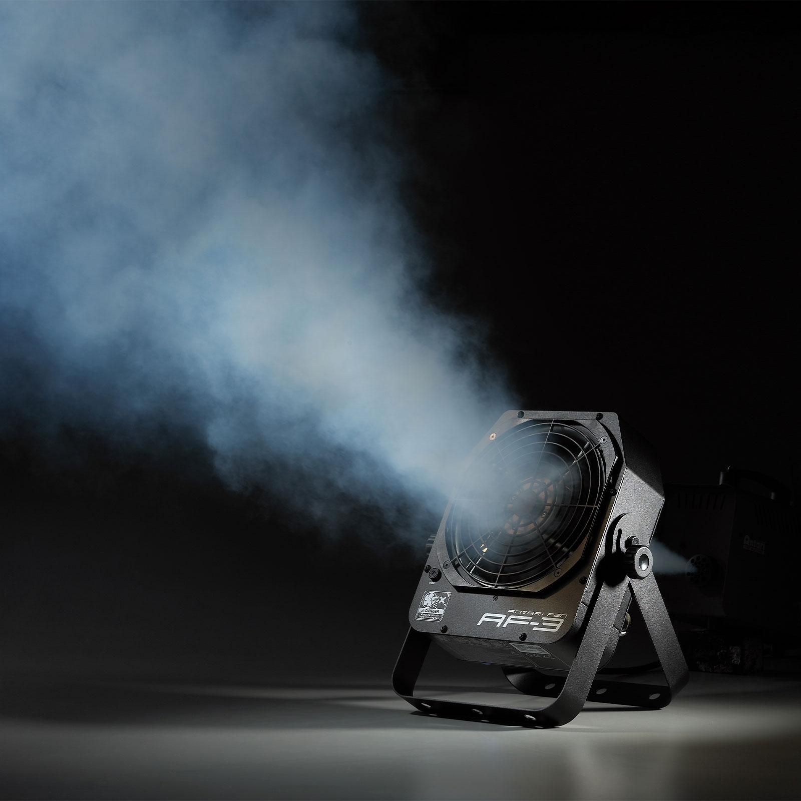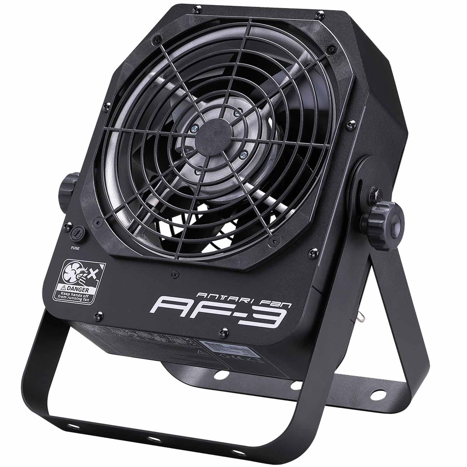 The Antari AF-3X is a compact, all-purpose stage fan that features 4 control options linear output control, low power consumption, adjustable output directions and a durable road worthy metal housing in a compact package. With on board DMX control and manual knob control as standard as well as wireless and wired remote control options. Low power consumption is only 100W allowing you to put on the same circuit as your fog machine. The adjustable mounting / floor bracket included allows you to adjust the fan output 90 degrees. Solid and handy design allows easy carry and storage.