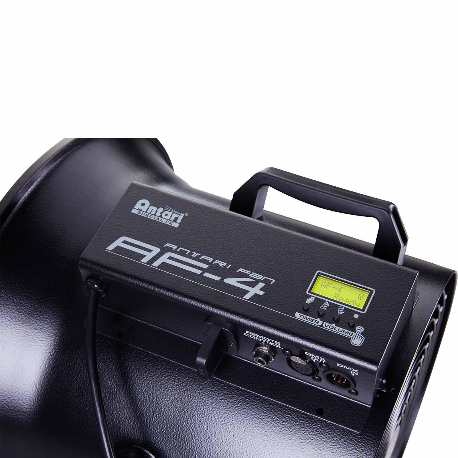 Antari锟斤拷s AF-4R special effect fan centrally focuses its airflow to produce a smooth wind effect of up to 20 meters. The AF-4R is suitable for a wide variety of applications including stage, theatre, cinema, and concert tours. Features include a (4) button LCD control menu display for easy manual control setting adjustments, timer control, on-board 5pin DMX in/out connections, and an adjustable floor stand that can also be used to hang the fan. The AF-4R comes with a Wireless Transmitter and Receiver. Optional wired remote controls options are available.