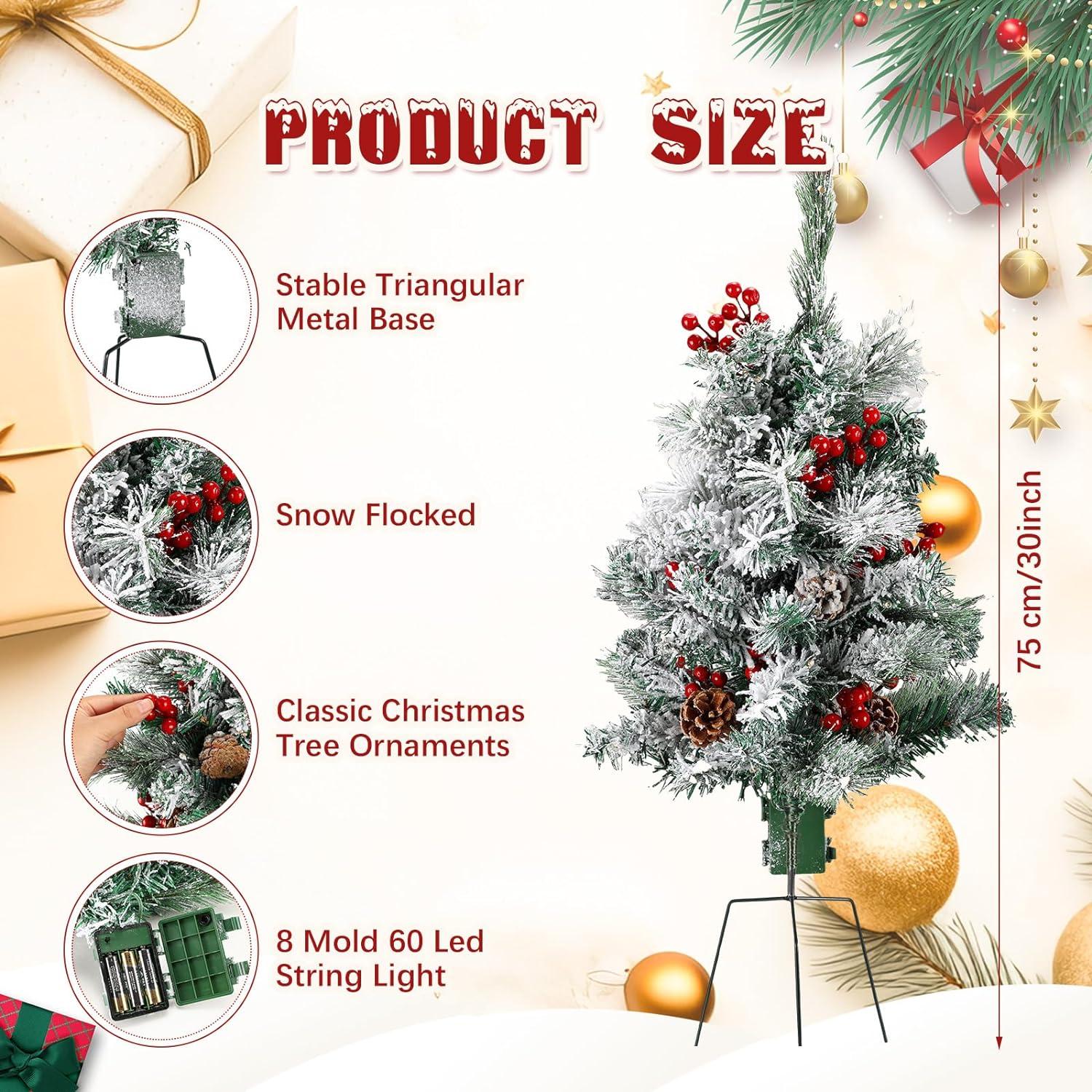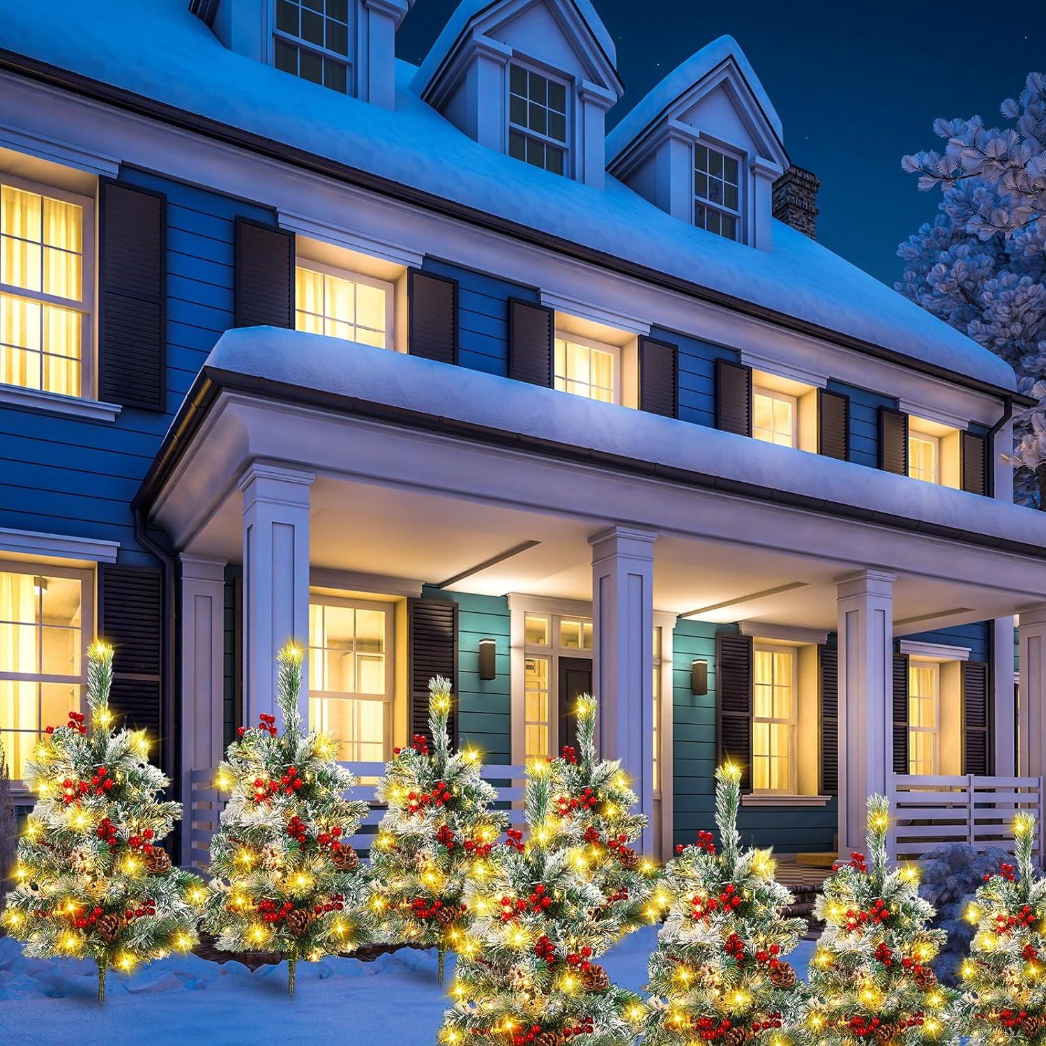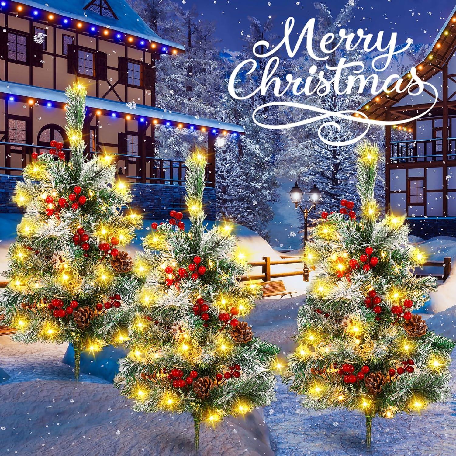 - Built in Stakes: this pre-lit Christmas tree is pre-stringed with 60 warm white LED lights per tree, powered by 3A batteries (need to configure by yourself) with 8 different modes, including combination, wave, sequence, slow glow, chase/ flash, slow fade, blinking/ flashing and Steady on for a beautiful glow in front of your home