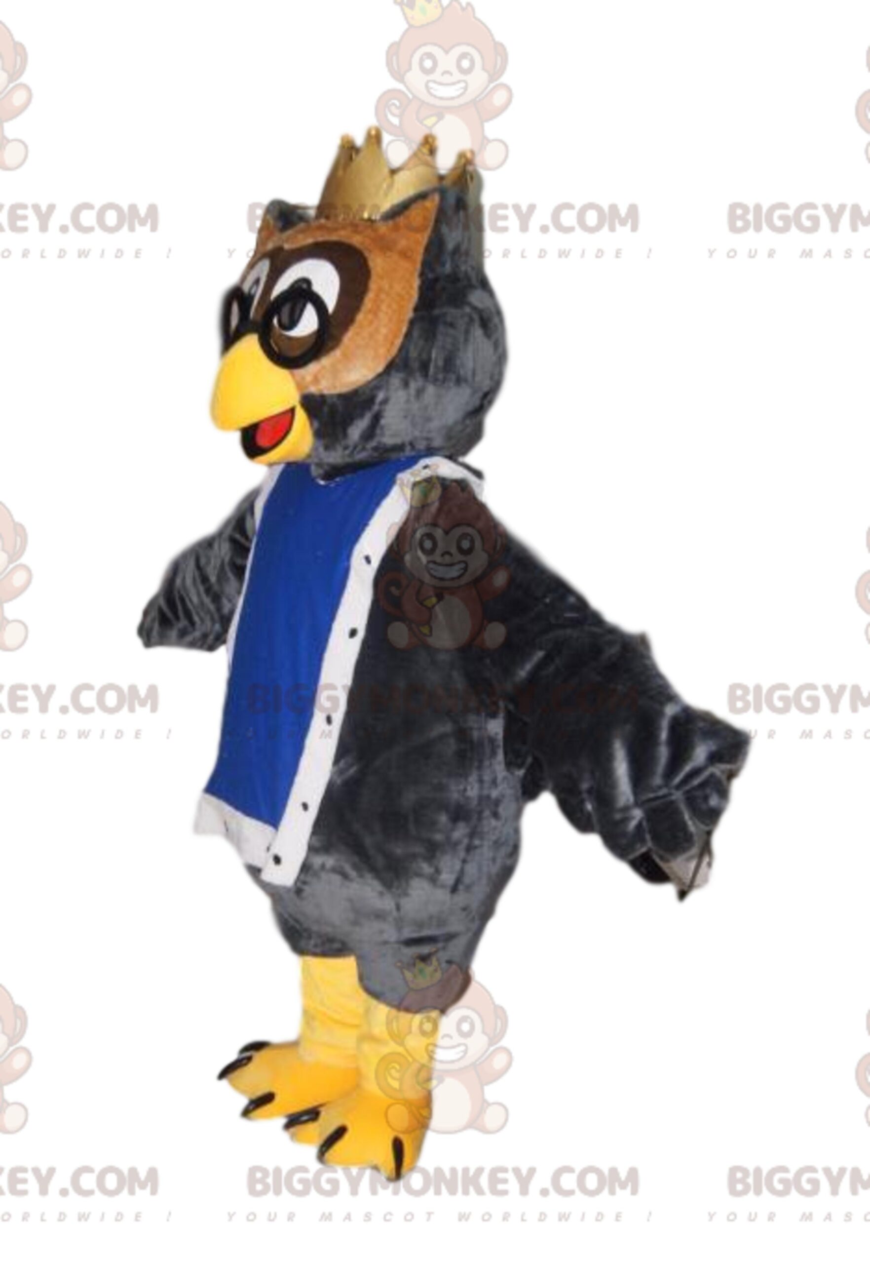 This owl mascot with a golden crown is superb! Studious with his dark glasses, our funny owl will be the King of your events. Owls are present in fairy tales! Our owl costume will animate a magic show, a festival on the Fantastic. It will represent a bookstore, a library or a university! Hire our owl and personalize it, for more fun!.