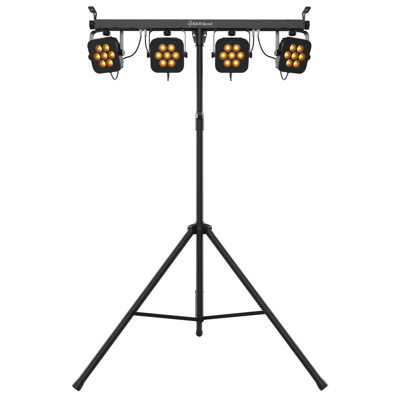4BAR Quad is a complete wash lighting solution fitted with high-intensity quad-color (RGBA) LEDs that can be controlled wirelessly out of the box via the included footswitch or optional IRC-6 controller. Generate natural, warm color temperatures with punchy amber and achieve total area coverage by individually positioning the 4 adjustable pods. 4BAR Quad is compatible with D-Fi USB for wireless Master/Slave or DMX programming. A convenient tripod and carry bag are included for effortless setup and quick tear down. 4BAR Quad safely attaches to truss with built-in bolts, easily increasing mounting options.