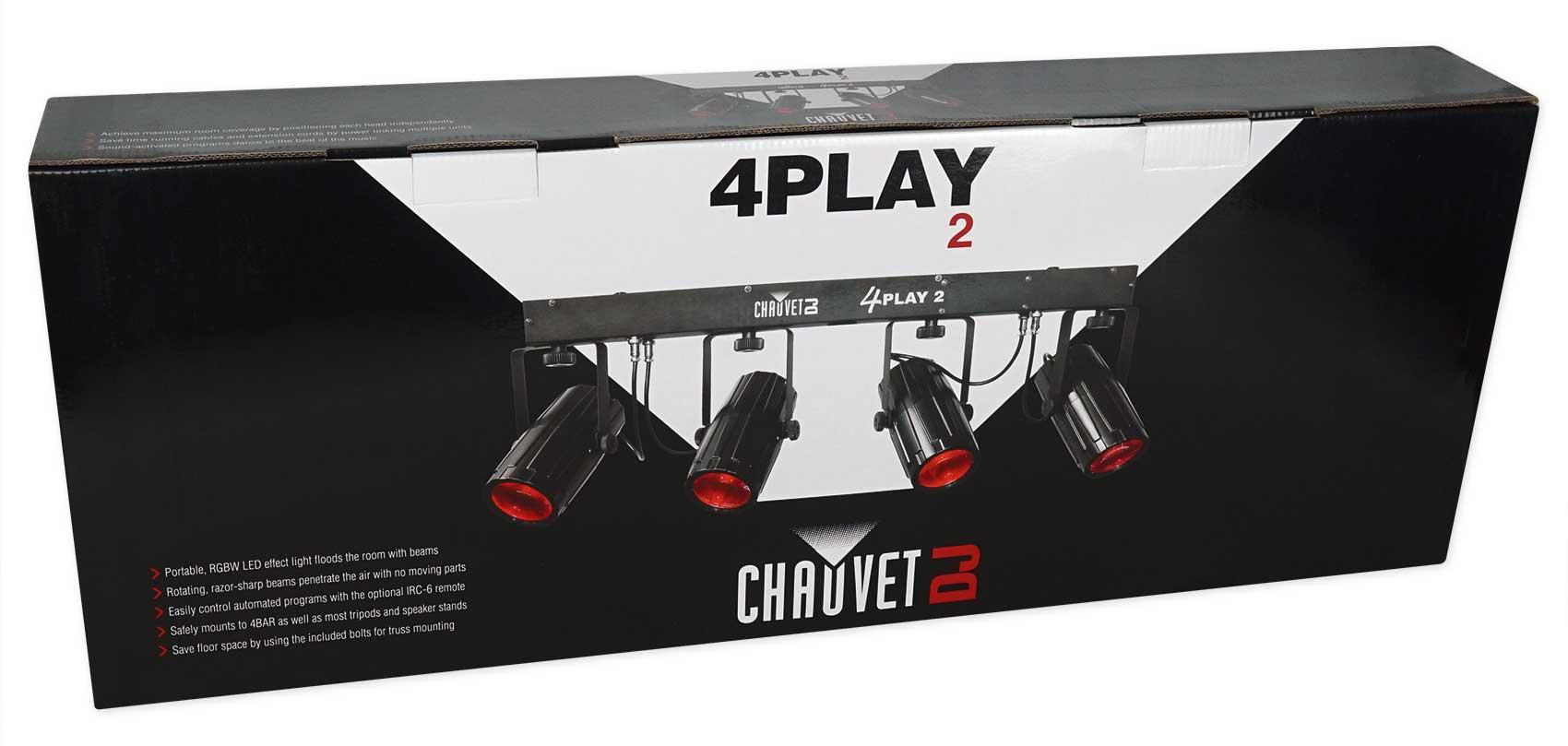 - Package Includes: (1) Chauvet DJ 4PLAY 2 RGBW DMX Light Bar Beam Moonflower Effect System+Bag 4PLAY2. (1) Rockville R700 Fog/Smoke Machine w/ Remote+Fluid Quick Heatup, Thick Fog. What’s Included: 4Play 2. Power cord. Carrying bag. Hanging bracket. Quick Reference Guide. Features: Chauvet DJ 4PLAY2 RGBW LED DMX Light Bar Beam Moonflower Effect System+Carry Bag. Portable, RGBW LED effect light floods the room with beams. Rotating, razor-sharp beams penetrate the air with no moving parts