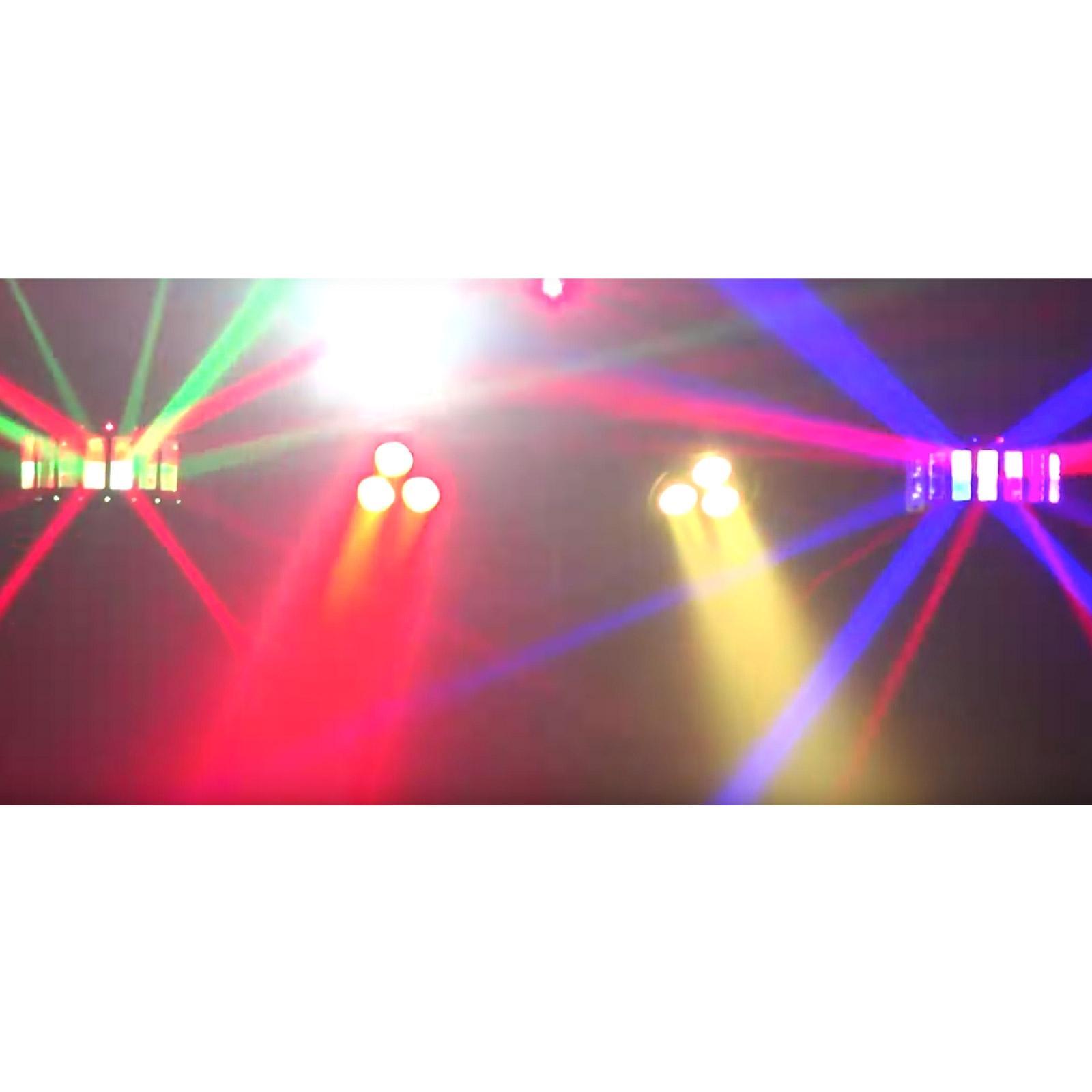 - 5-in-1 lighting system that includes moving heads, derbies, washes, a laser strobe effect pre-mounted on a single bar.
