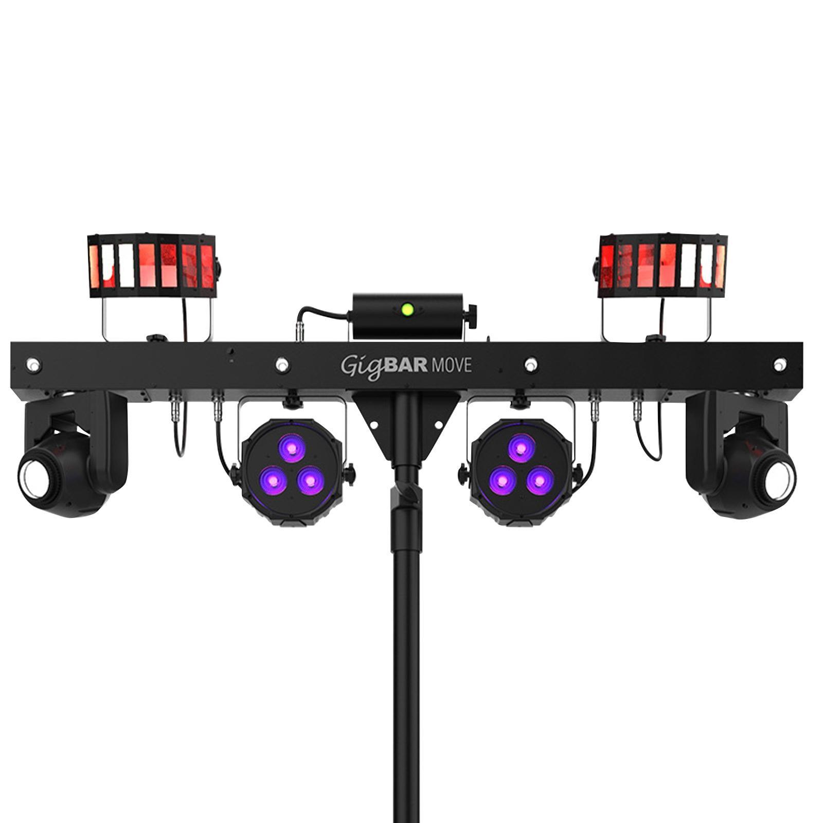 Ultimate gig lighting convenience, versatility and power is packed into GigBAR Move, a 5-in-1 lighting system that includes moving heads derbies, washes, a laser, and strobe effect pre-mounted on a single bar. That means a complete light show is available from this single system that includes a tripod, wireless foot switch, and free carry bags to ensure quick setup. The moving heads have separate color and gobo wheels to enhance creative programming possibilities, plus built-in Totem Mode to keep the moving heads focused on the dance floor. Individual control of each effect ensures your show looks the way you need it to and events can be energized with dynamic effects like built-in UV LEDs to illuminate florescent objects and make them pop. Controlling GigBAR Move is also easy. Stand-alone control, DMX, wireless IRC-6 remote, or wireless foot switch options are all on board. GigBAR Move is also compatible with GigBAR 2 in master/slave mode for huge coverage and dynamic light shows.