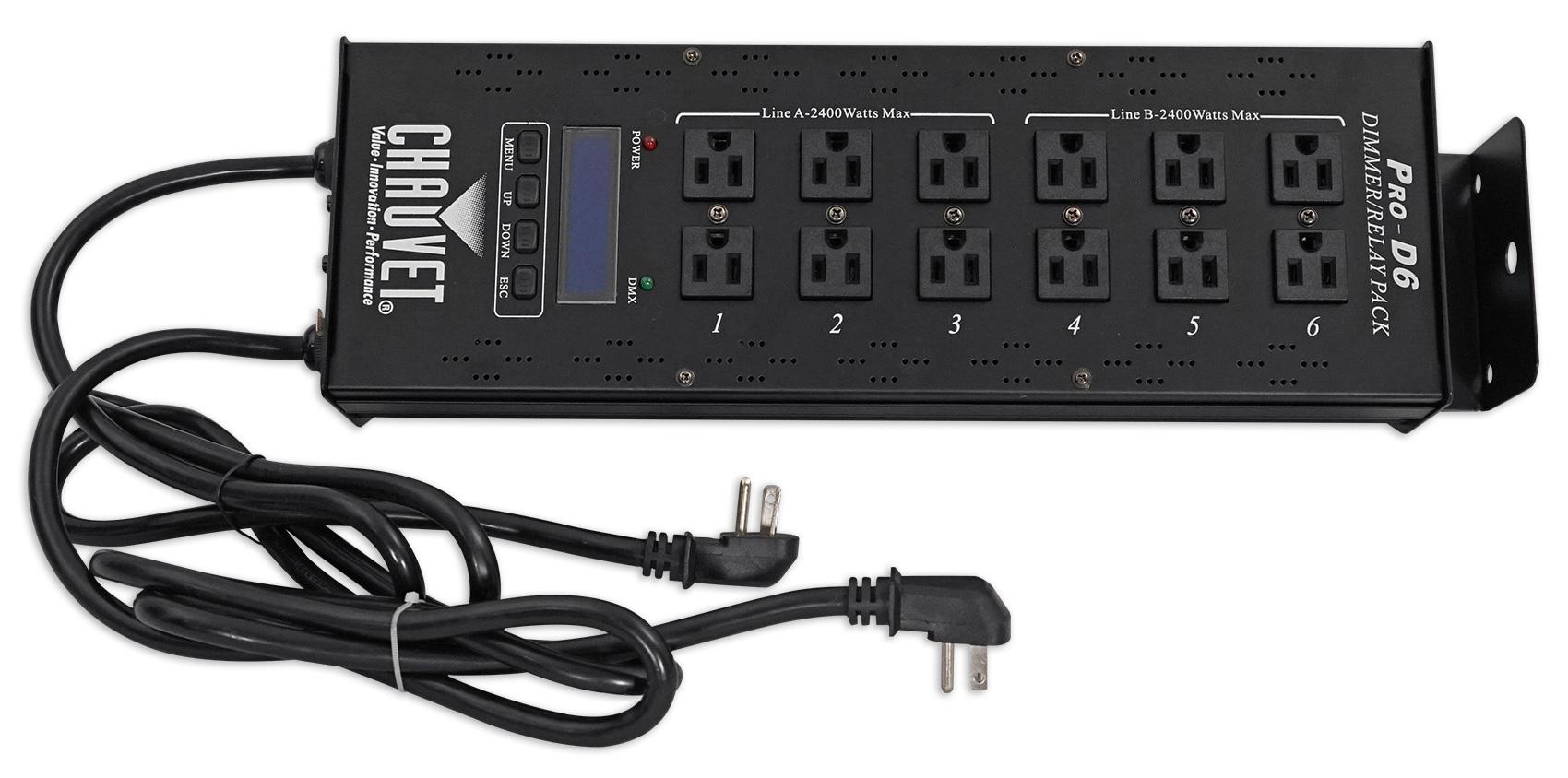 The Pro D6TM is a 6-channel DMX-512 dimmer/switch pack designed to work onmultiple voltages (115V and 230V) simultaneously, and comes fitted with 20 ampconnectors for this purpose. It offers variable electronic dimming and eachchannel can be set as either dimmer or relay.