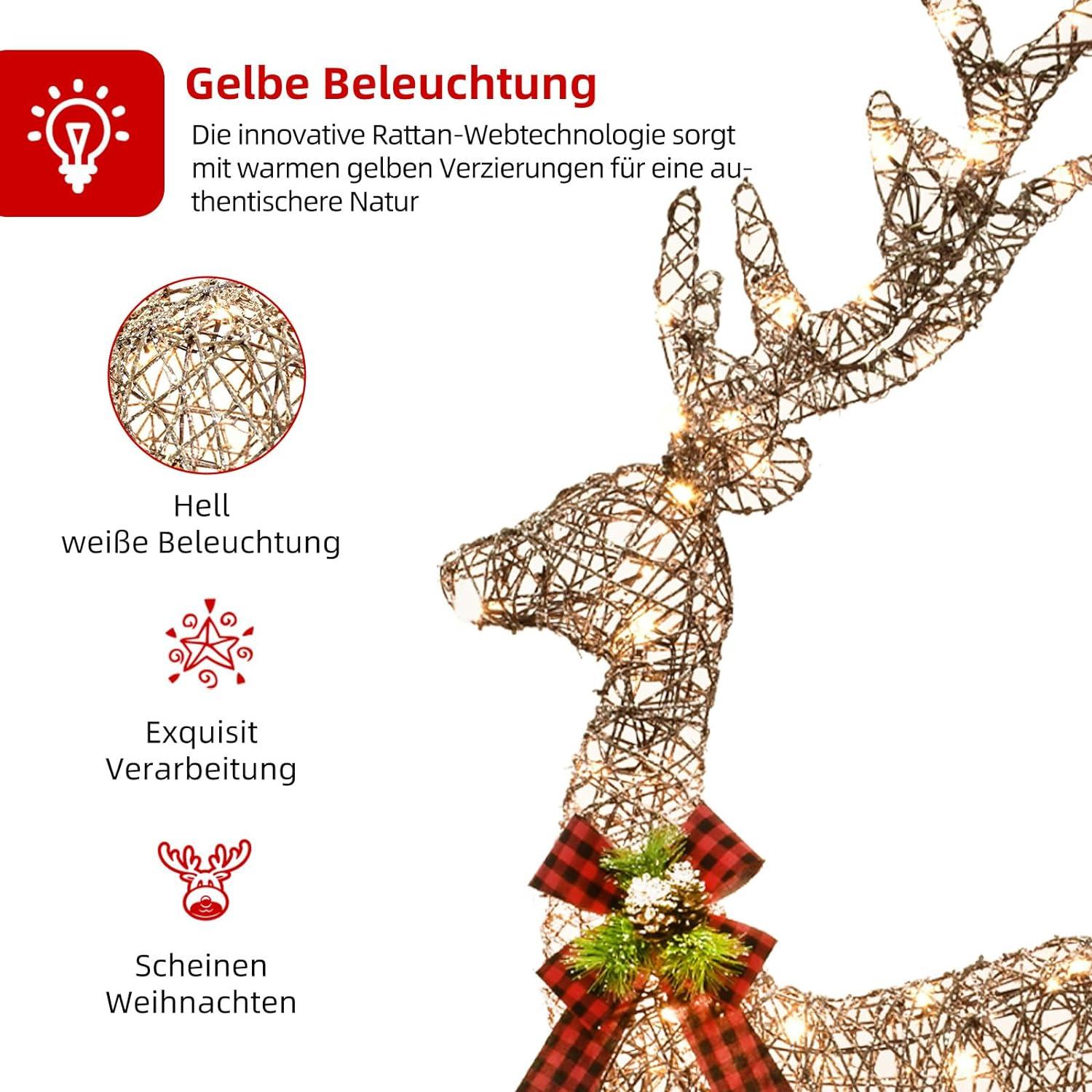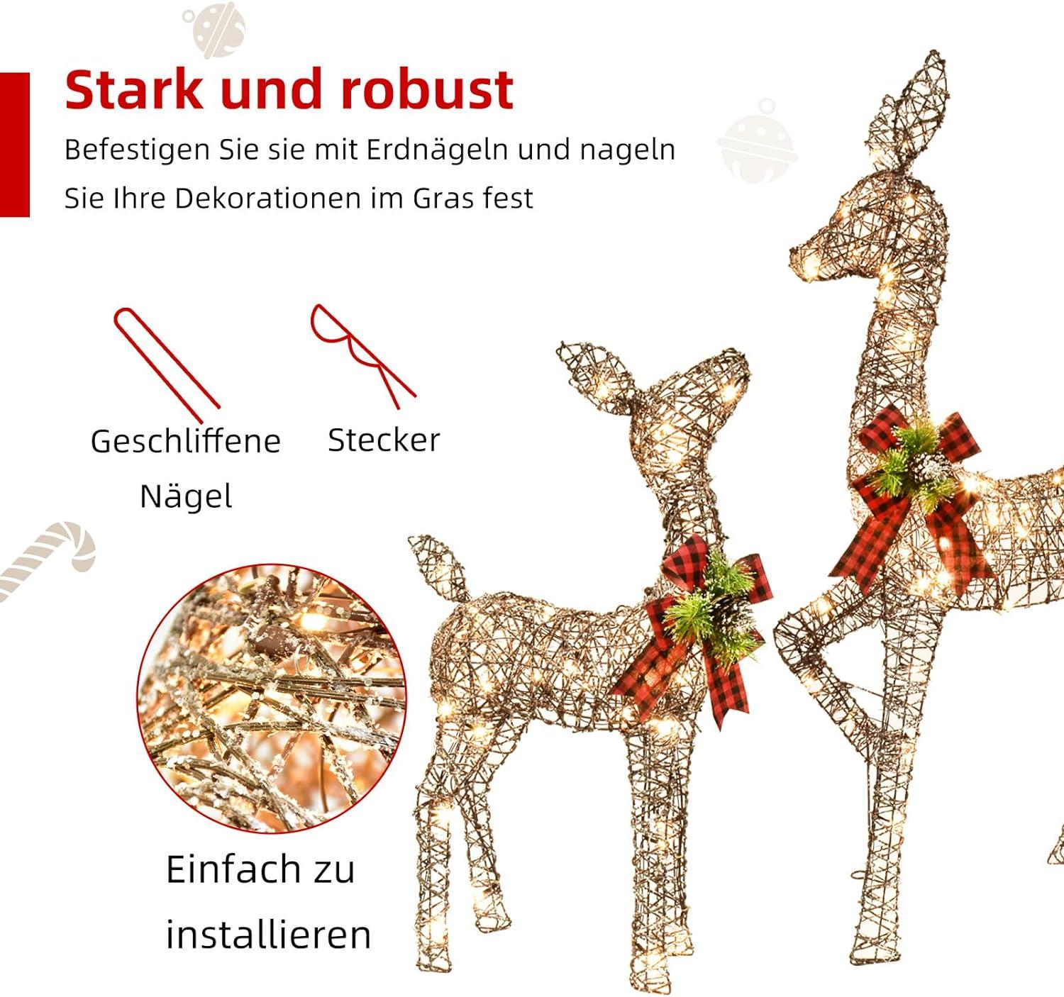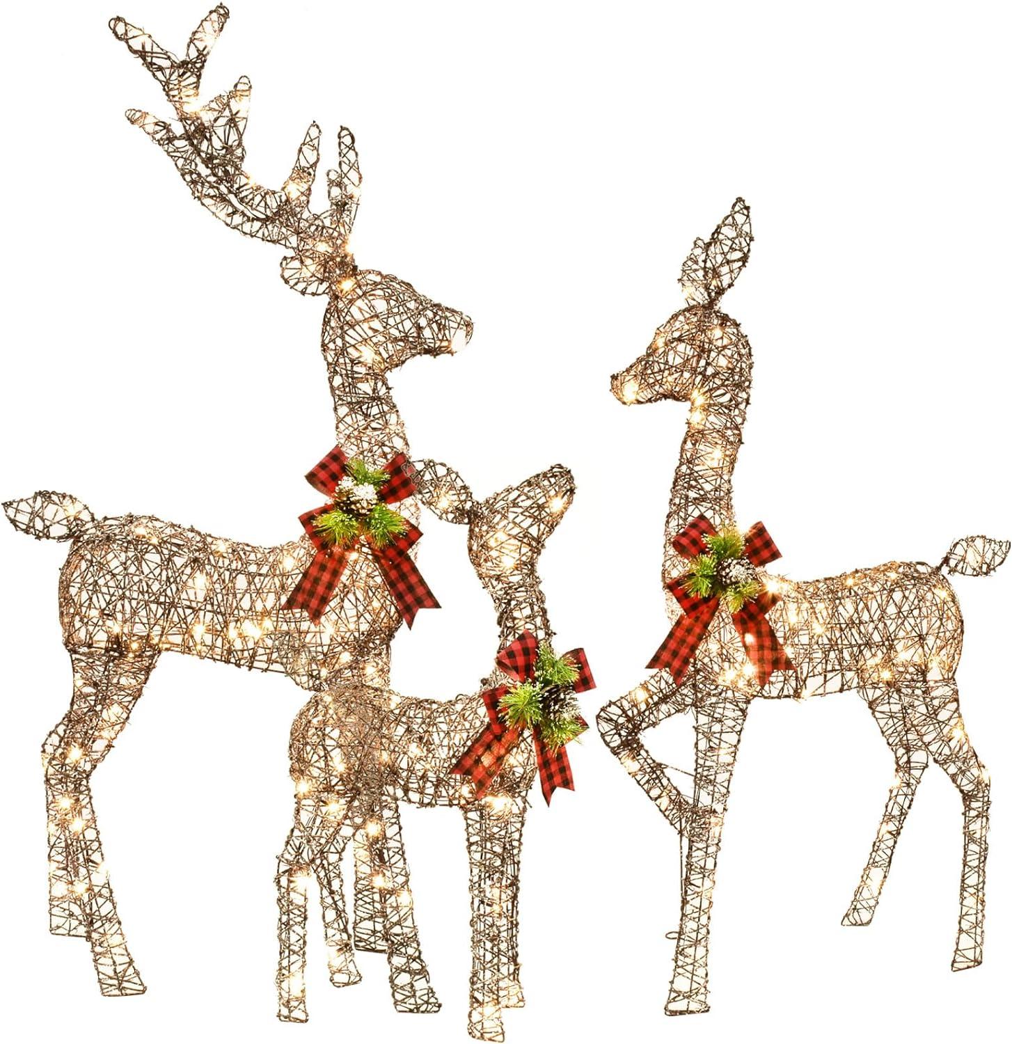 - 🎄 🔔 Illuminate Your Outdoors with Lighted Deer Family Set: Add a magical touch to your front yard and embrace the winter season with this Lighted Christmas decorations Deer Family Set. This set includes a majestic buck, graceful doe, and adorable fawn, all aglow with the warmth of Christmas. Light up your yard and immerse yourself in the festive spirit of the holidays.