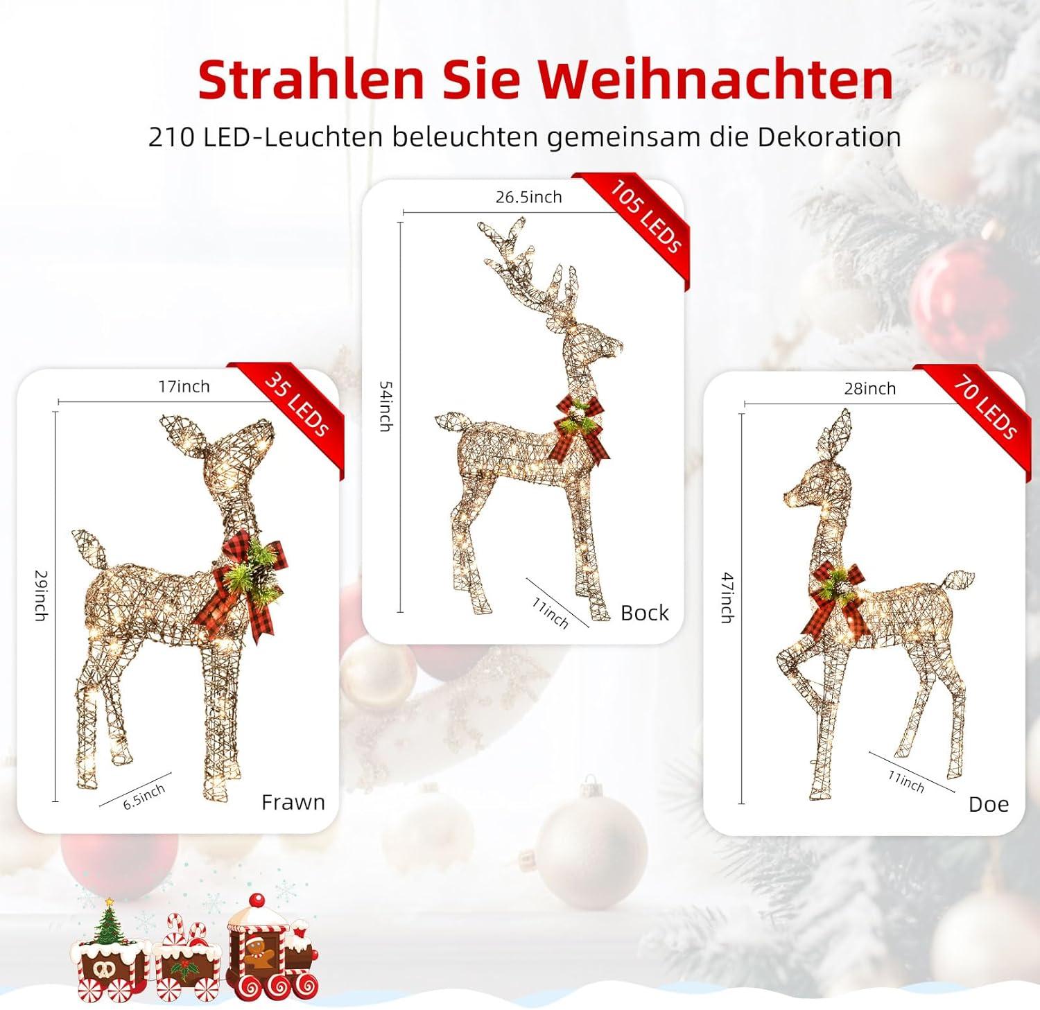 - 🎄 🔔Mesmerizing Christmas Decor with 210 LED Lights: Watch as your yard transforms into a winter wonderland with the soft, inviting glow of 210 LED lights. The buck shines with 105 LED lights, the doe with 70, and the fawn with 35. These lights create a cozy ambiance that’s perfect for your front yard, garden, porch, lawn, garage, or even inside your home during the winter months. Let the Lighted Christmas Decorations Reindeer Family Set spread the warmth of Christmas cheer to your loved ones.