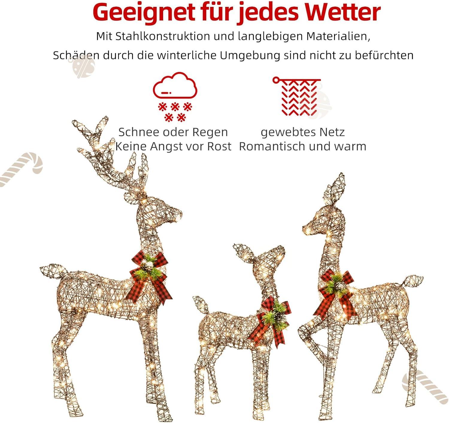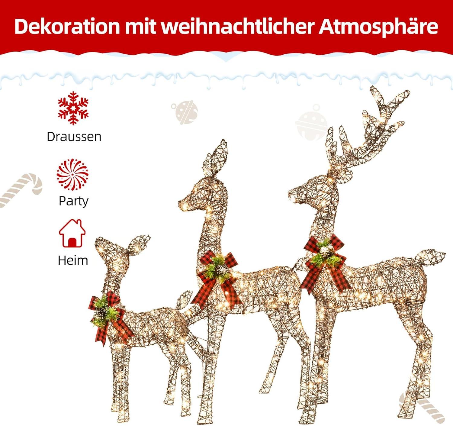 - 🎄 🔔Convenient Power Supply and Extension Cord: Our Lighted Christmas Decorations Deer Family Set operates on a plug adapter with a voltage range of 100-240V. What’s more, it comes with a generous 32FT Outdoor Plug Extension Cord, ensuring easy and flexible placement in your outdoor space. Brighten up your surroundings with this hassle- Lighted Christmas Outdoor Reindeer 3 Piece Set.