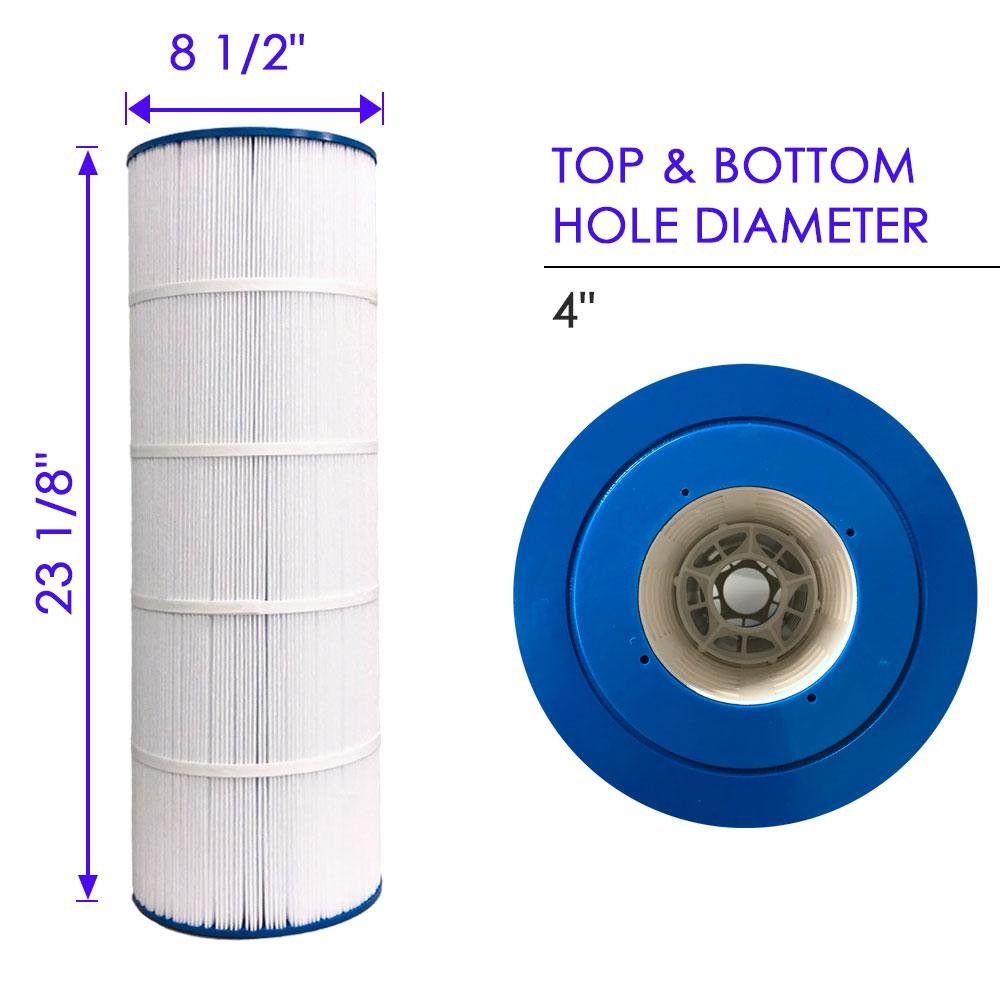 • Cartridge Dimensions – Height: 23 1/8″, Outside Diameter: 8 1/2″, Hole Diameter: 4″, Filtration Area: 100 sq ft each