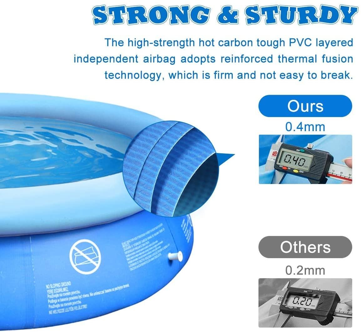 • 【PREMIUM PVC MATERIAL】- Smooth streamlined surface without protruding, made in 3-ply high-density superior material. Tear-resistant and can withstand high water pressure. It won’t fade even after long-time sun exposure, enables you to enjoy the blow up pool with your family in every summer.