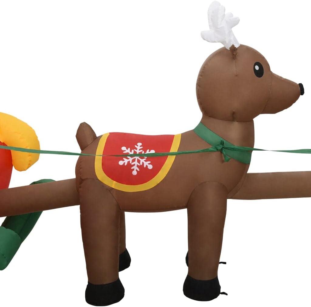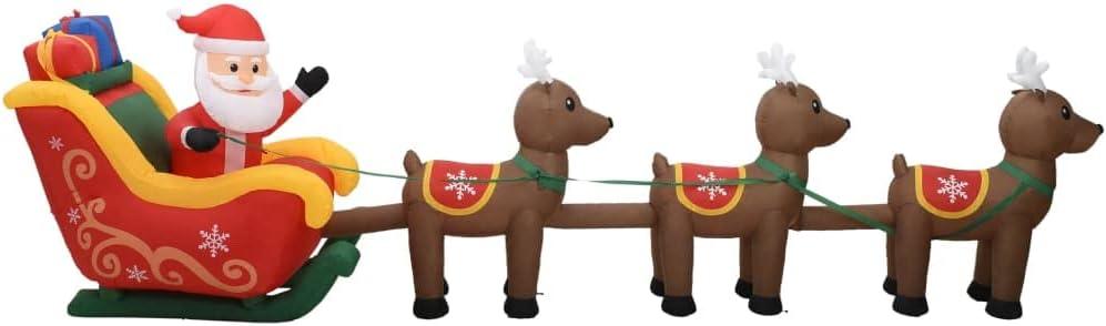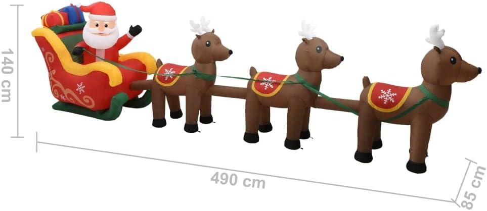 - The Inflatable Santa is made of fabric and decorated with three reindeer and a Father Christmas. It inflates automatically in seconds and is equipped with 5 LEDs that emit bright light, this Christmas decoration is very energy efficient.