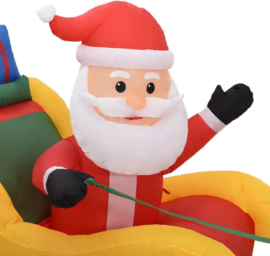 - Color: Multicolor.Material: Fabric.Dimensions: 192.9″ x 33.5″ x 55.1″ (L x W x H).Input voltage: 100 – 240 V~.Output voltage: 12 V⎓.Power: 25 W.With 5 energy-saving LEDs.Includes 1 blower integrated into the inflatable Santa to keep the airflow in the product.With an adapter.Self-inflatable.Easy to set up and store.Weather-resistant.Suitable for indoor and outdoor use.Assembly required: No.Delivery contains:1 x Body.1 x Adapter.2 x Rope.10 x Ground stake.