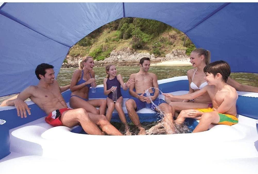 • 1.Dimensions (Overall): 108 inches (L), 153 inches (H) x 108 inches (W) | Weight: 3.1 lbs.Perfect party float: This large floating island is the ideal solution for ultimate summer fun for adults and kids. It can comfortably fit up to 6 people with extra wide pillow backrests and built-in cup holders for each person.