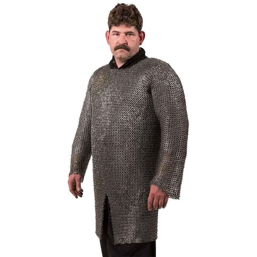 The Flat Ring Round Riveted Chainmail Hauberk is a great choice for historical and fantasy warriors. Made of 18 gauge steel, it is ideal armour for light reenactment, LARP, and costume use, whether dressing as a knight or Viking. The flat rings have a traditional 4-in-1 pattern weave. A 4-in-1 pattern consists of four chainmail rings woven through another ring. Dome rivets provide extra durability. Each woven steel ring has a diameter of 8mm. The long sleeve design provides comprehensive coverage, while the bottom edge is split at the front and back for better mobility. For your next Renaissance event, LARP, or other costume occasion, this steel hauberk makes an excellent choice.Key Features:Made of flat rings woven in a 4-in-1 patternRings are secured with round rivetsLong sleeves provide coverageSplit at back and front for mobilityGreat for light reenactment, LARP, and costume useMaterials:Made of 18 gauge mild steelCare Instructions:Occasional oiling is necessary for the proper maintenance of this armour. | Flat Ring Round Riveted Chainmail Hauberk, size: Medium | Steel by Medieval Collectibles