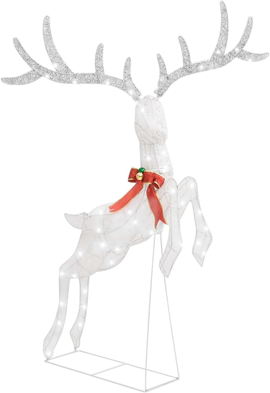 Decorate your house with this Christmas flying reindeer. It comes with a beautiful bow on its neck to add a special touch. Made of b fabric, this Xmas decoration is durable. The glowing reindeer features 120 LED lights, which are energy-efficient and long-lasting. Thanks to the mesh design, it produces a magnificent effect while lighting. Designed with 8 different lighting effects: a combination of all the effects, slow-glow, twinkle/flash, in wave, chasing/running water, sequential, steady on and slow fade, it beautifully lights up and creates a magical holiday atmosphere. Note: The included USB is not waterproof so this part has to avoid the water, but thanks to the 16.4′ cable the reindeer can be used outdoors as the cable and product are waterproof. The product has a USB connector, but the certified 5V USB power source is not included.Color: White and silverLight color: Cold whiteMaterial: FabricDimensions: 41.3″ x 27.6″ x 57.1″ (L x W x H)Cable length: 16.4’Voltage: DC 5 VPower: 5 WWith 120 energy-saving LEDsA USB is includedStrong fabricSuitable for indoors and outdoorsCalifornia Proposition 65