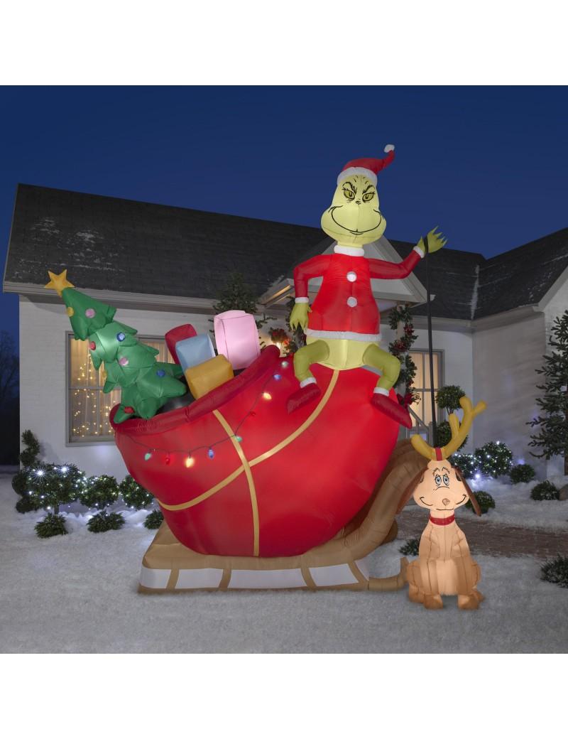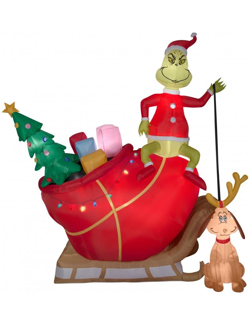 Right out of your favorite Christmas special, here is the Grinch with his sleigh and cute special reindeer. This giant Airblown inflatable yard decor stands 12 feet tall! Airblown gives your decor maximum impact with minimum effort and it comes with everything you need for quick and easy set-up. You just stake it down and plug it in. Lights up with clear lights Self-inflates in seconds Deflates for easy storage Measures approximately 12 ft tall, 53 inches wide, and 118 inches long. Made of Fabric,60%; Metal,20%; Plastic,20%.