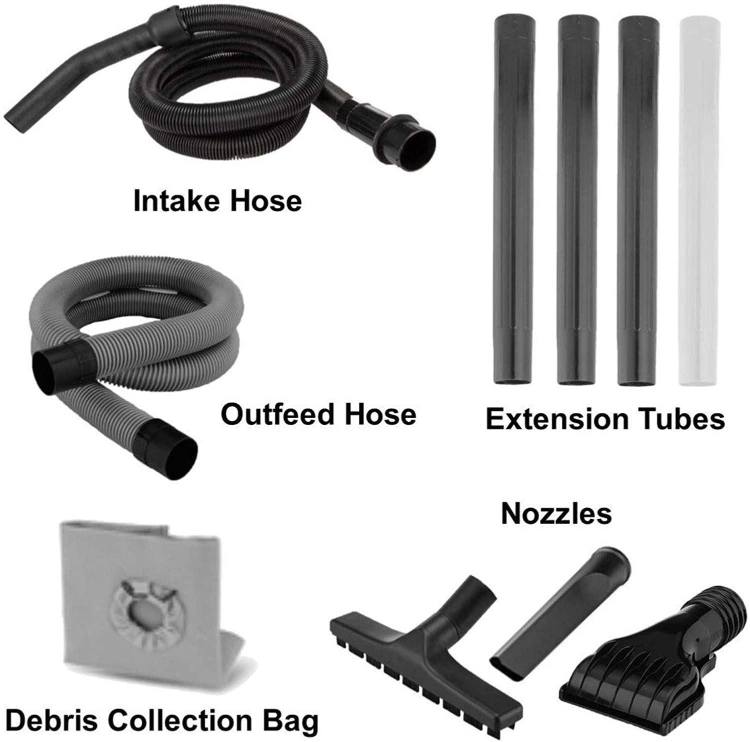 • Includes 13 foot intake hose, 4 extension tubes, 3 vacuum nozzles, 6.5 foot outfeed hose, debris collection bag that attaches to outfeed hose