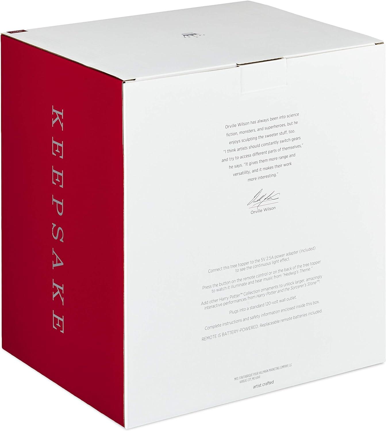 - Storytellers Interactive Light and Sound Christmas tree topper. Connect this tree topper to the power adapter (included) to see the continuous light effect. Press the button on the remote control or on the back of the tree topper to watch it illuminate and hear music from “Hedwig’s Theme.” No batteries necessary.