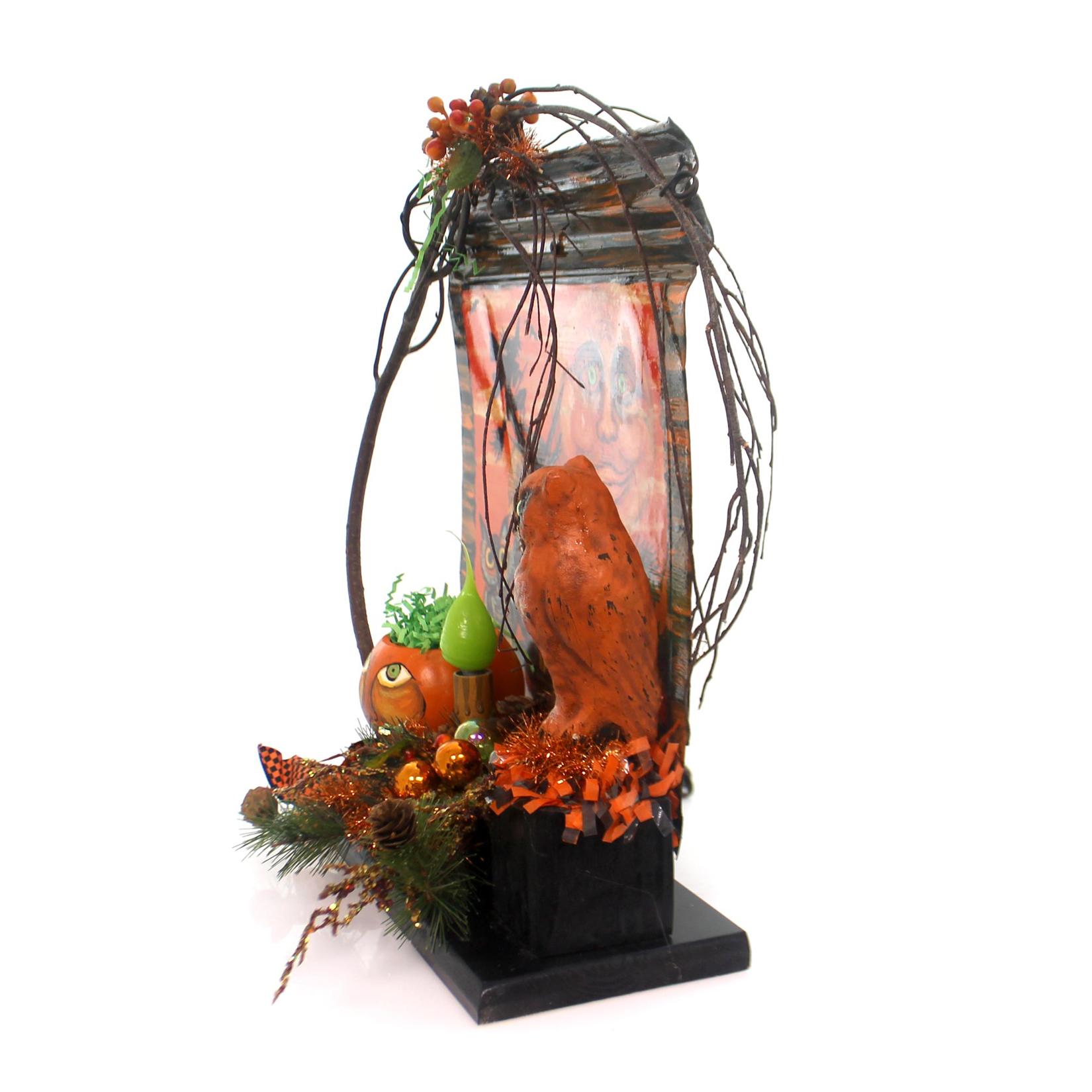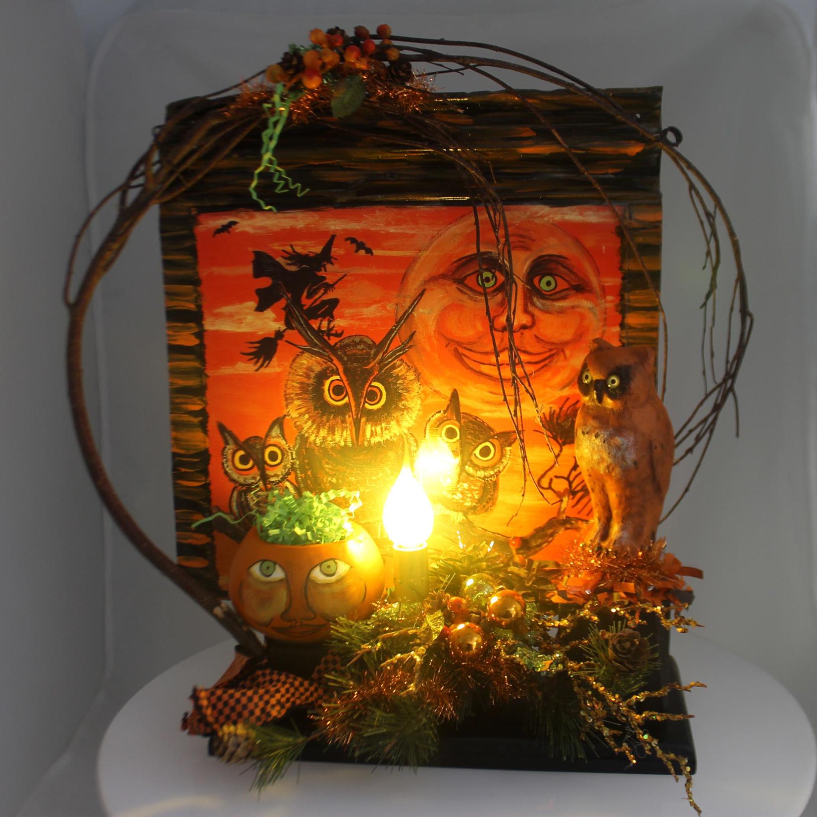 • Halloween Moon And Owl Electric Figurine Metal Lighted Pumpkin Grapevine Ch93