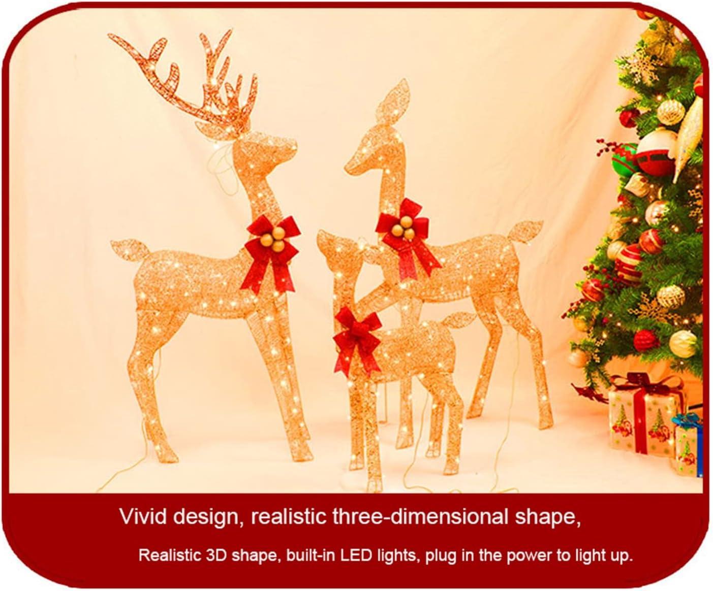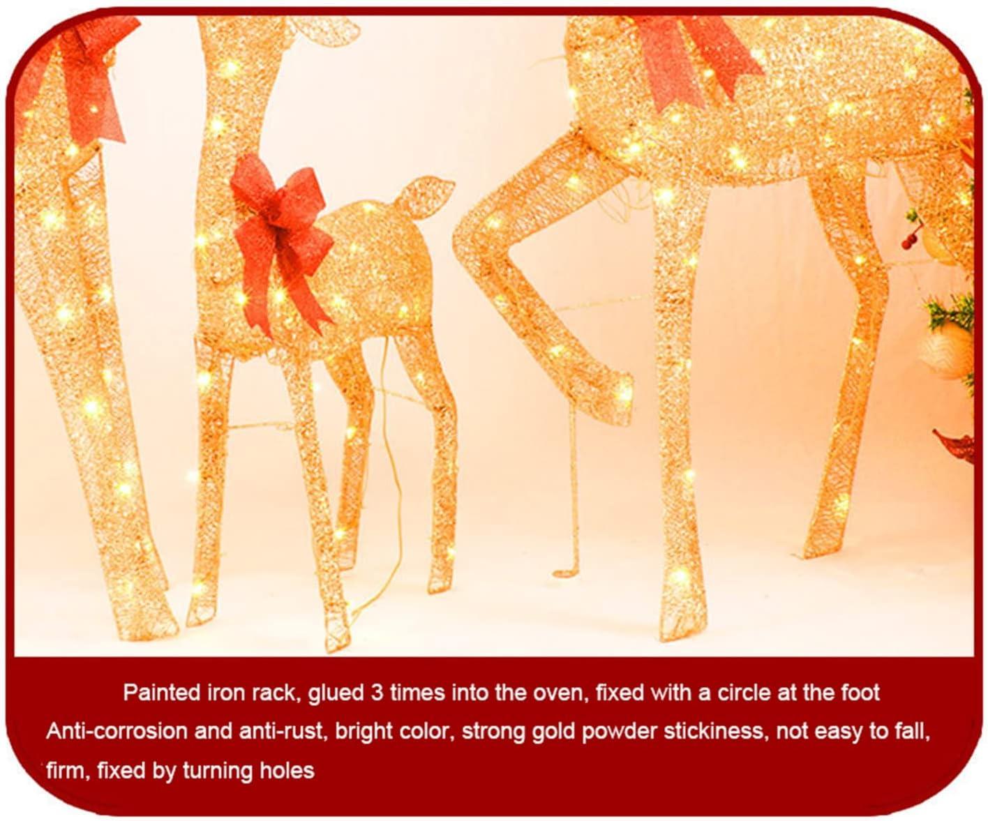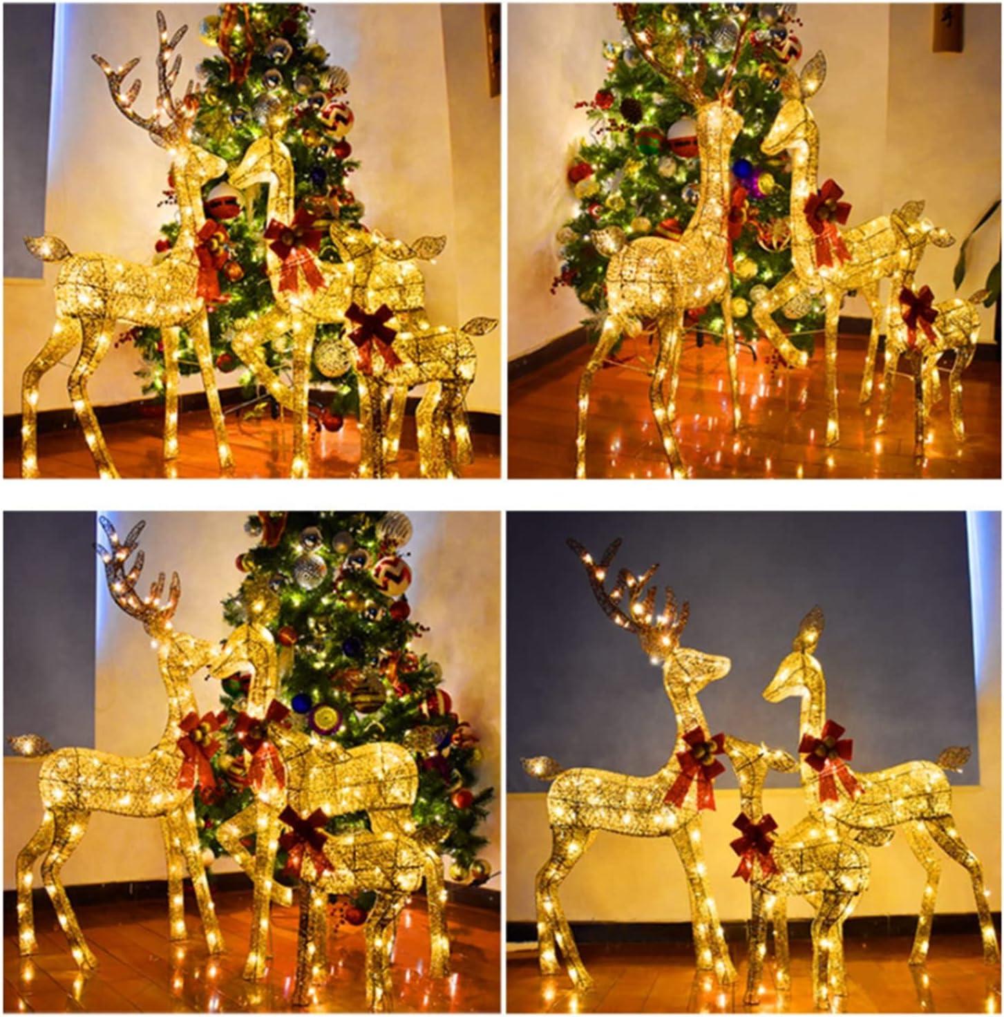 • Elegant Details: Male deer: 145*65*50cm,Doe: 120*80*20cm,Fawn: 75*50*15cm. Christmas outdoor decorations with 3 lighted deer family, Intricately designed with festive details like decorative bows and a shimmery, champagne, and red fabric for Christmas decorations.