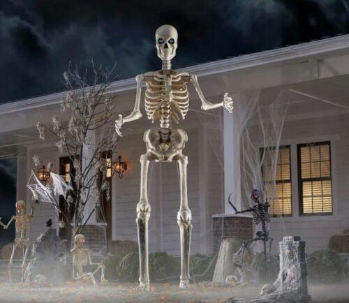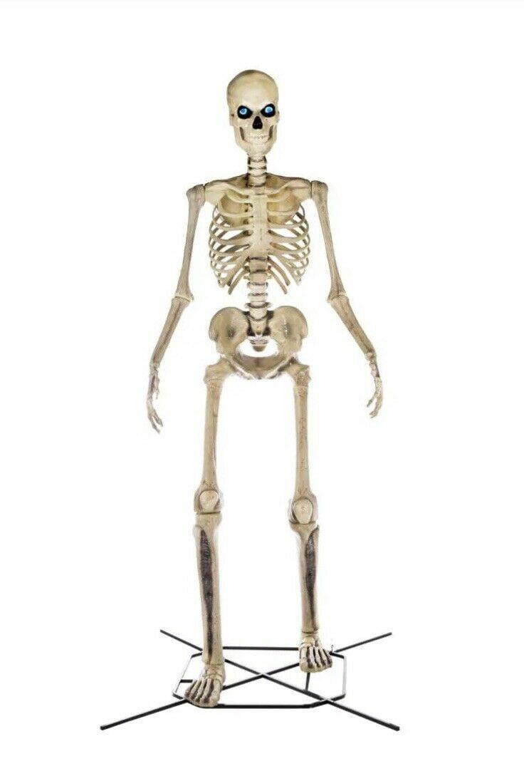 This Giant-Sized Skeleton. This Giant Skeleton will be the statement piece for your Halloween scene. LCD realistic eyes appear to move and blink as it activates. Comes with durable metal frame and ground stakes for stability. Timer function: 6-hours on/18-hours off.
