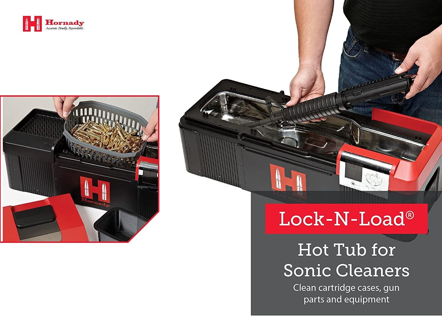 - Hornady Sonic Cleaner – Using a combination of intense ultrasonic cleaning action and a unique cleaning solution, this Hornady Hot Tub Sonic Cleaner quickly removes tarnish, oxidation, and carbon buildup from cases. Make easy work of brass preparation! Long enough to accommodate and clean a 16 inch AR-15 upper