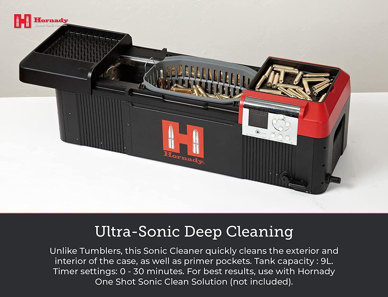 - Product Details – Item No. 043310. Tank dimensions : 25.5 x 7 x 4 inches. Tank capacity : 9L. Timer settings: 0 – 30 minutes. For best results, use with Hornady One Shot Sonic Clean Solution (not included)