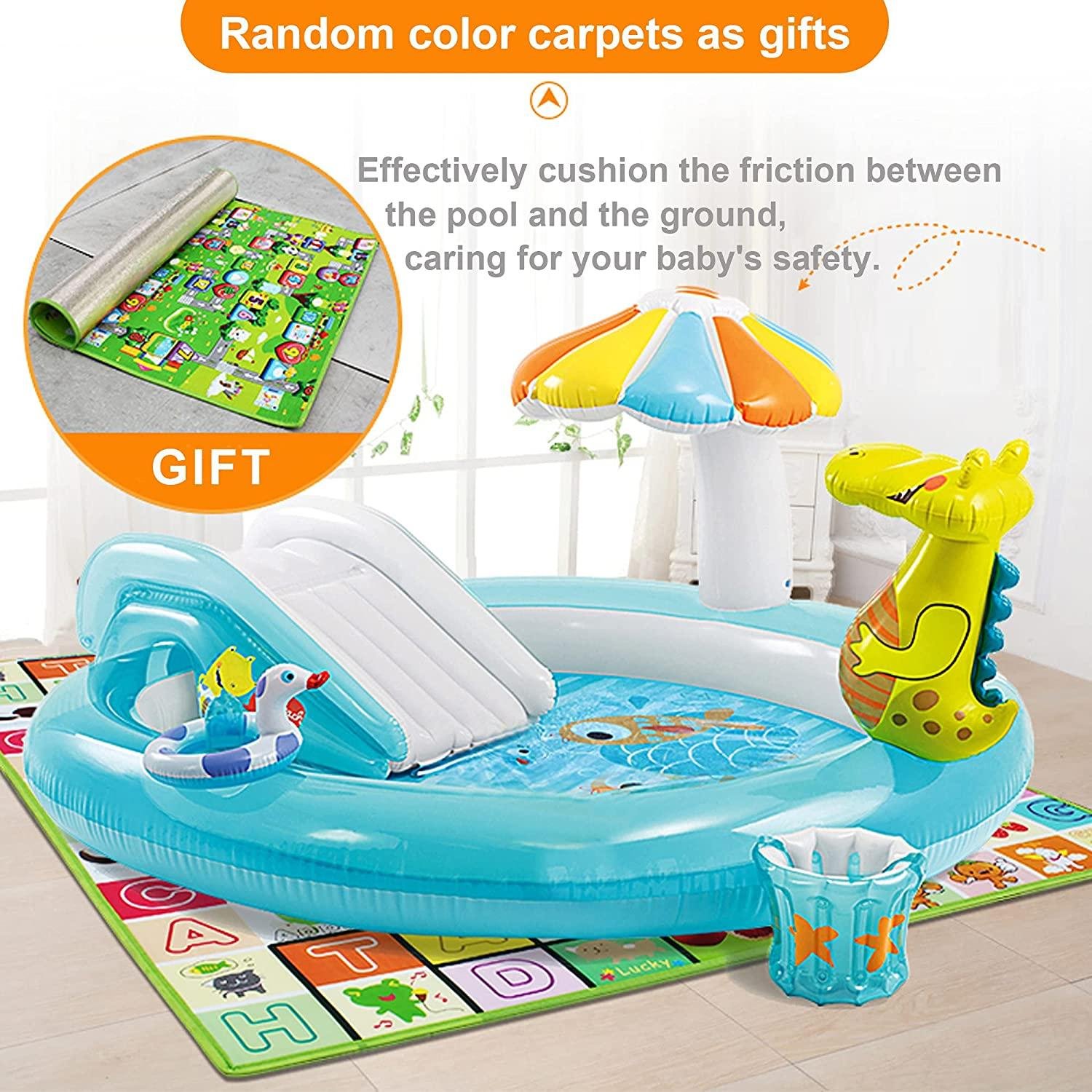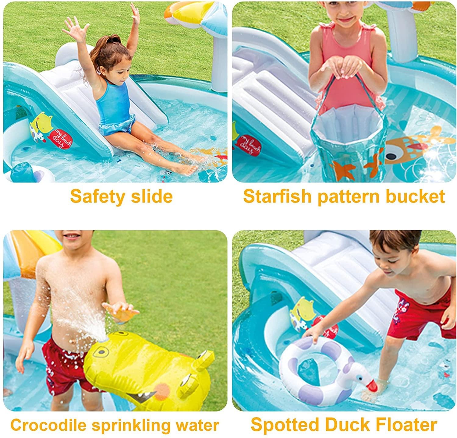 • 💕Equipment high-efficiency inflatable electric pump X1, sprinkling crocodile cartoon slide pool X1, spotted duckling float X1, starfish bucket X1, colorful ball X50, rich props make children more fun.