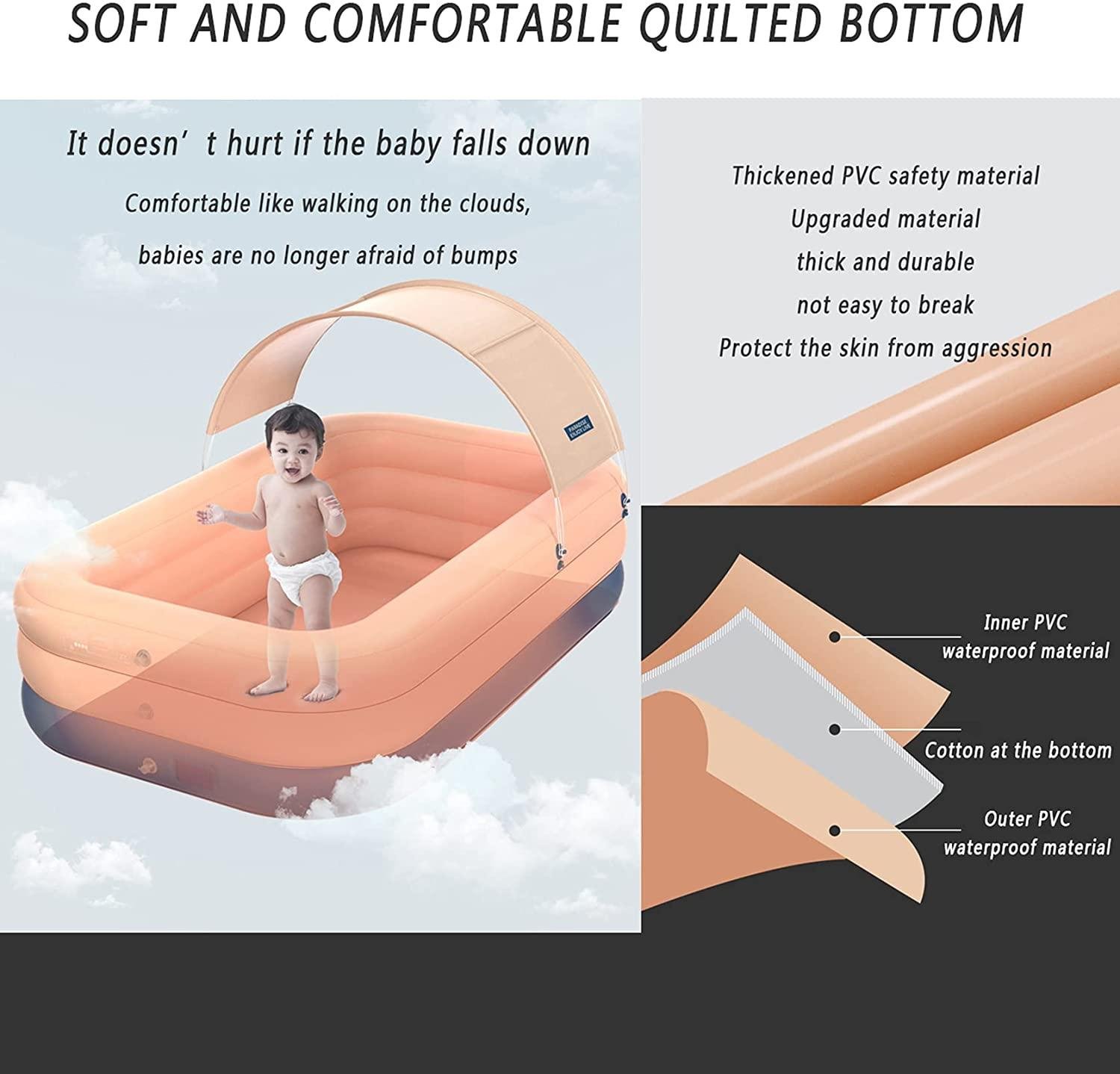 • SAFE AND FIRM: This inflatable swimming pool is made of high-strength, tough and BPA-free PVC material, environmentally friendly, non-toxic, wear-resistant and durable, which can reduce the risk of puncture and ensure a longer service life. The bottom is filled with thick sponge The material effectively prevents the cold on the ground, not only stronger, but also very elastic, preventing babies from falling and tingling while swimming or playing in the pool, and enjoy the bright summer time