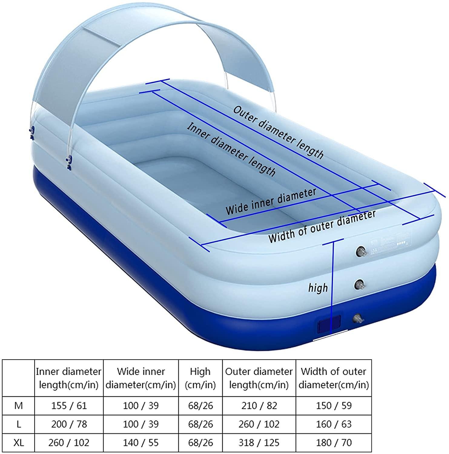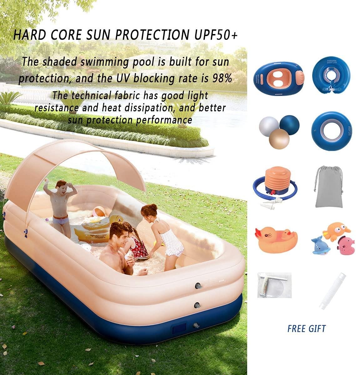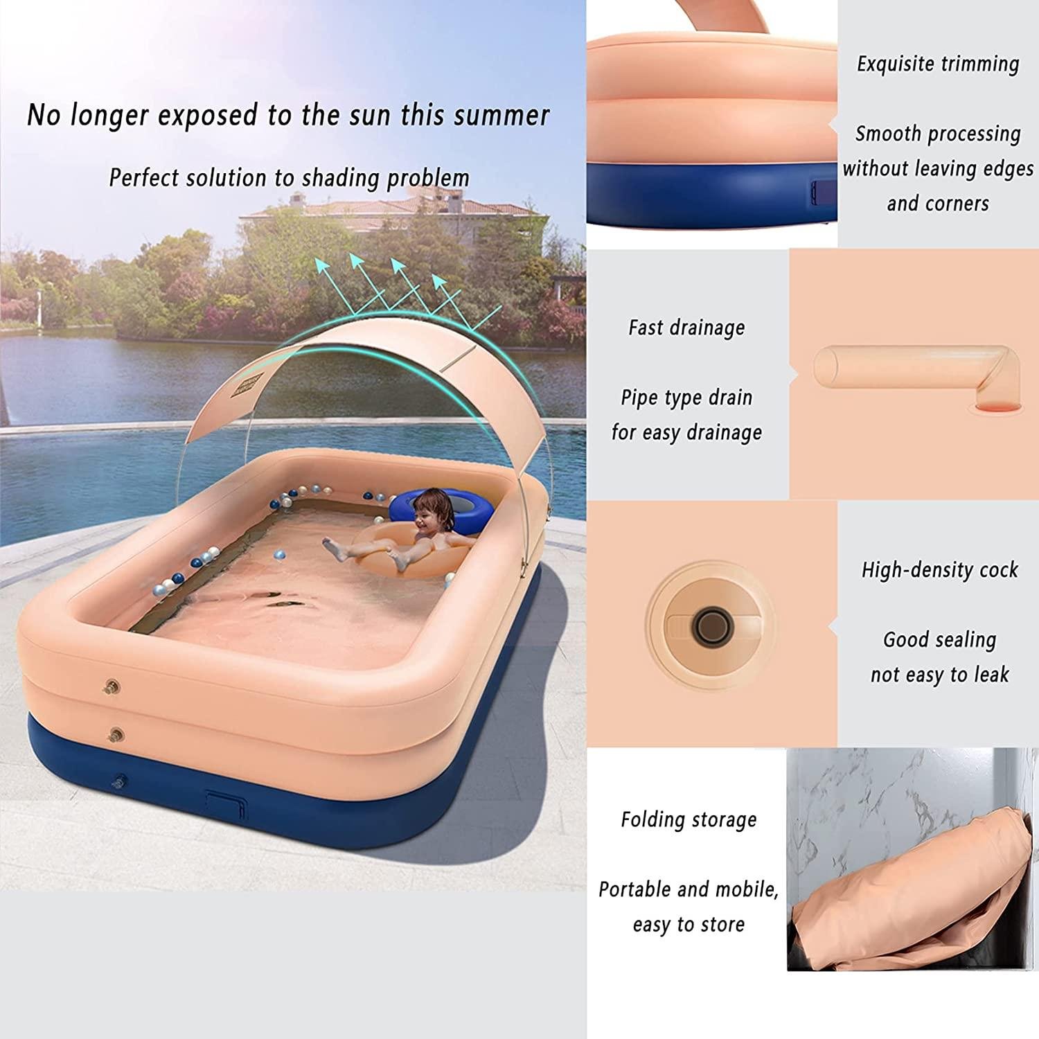 • FAMILY-SIZED SWIMMING POOLS: Inflatable family swimming pools are designed in various sizes, and the largest version can hold 500 bal of water. It is large enough to accommodate 3 adults and 5 children; there is an awning on the top, so you can also enjoy a cool splashing party in hot summer