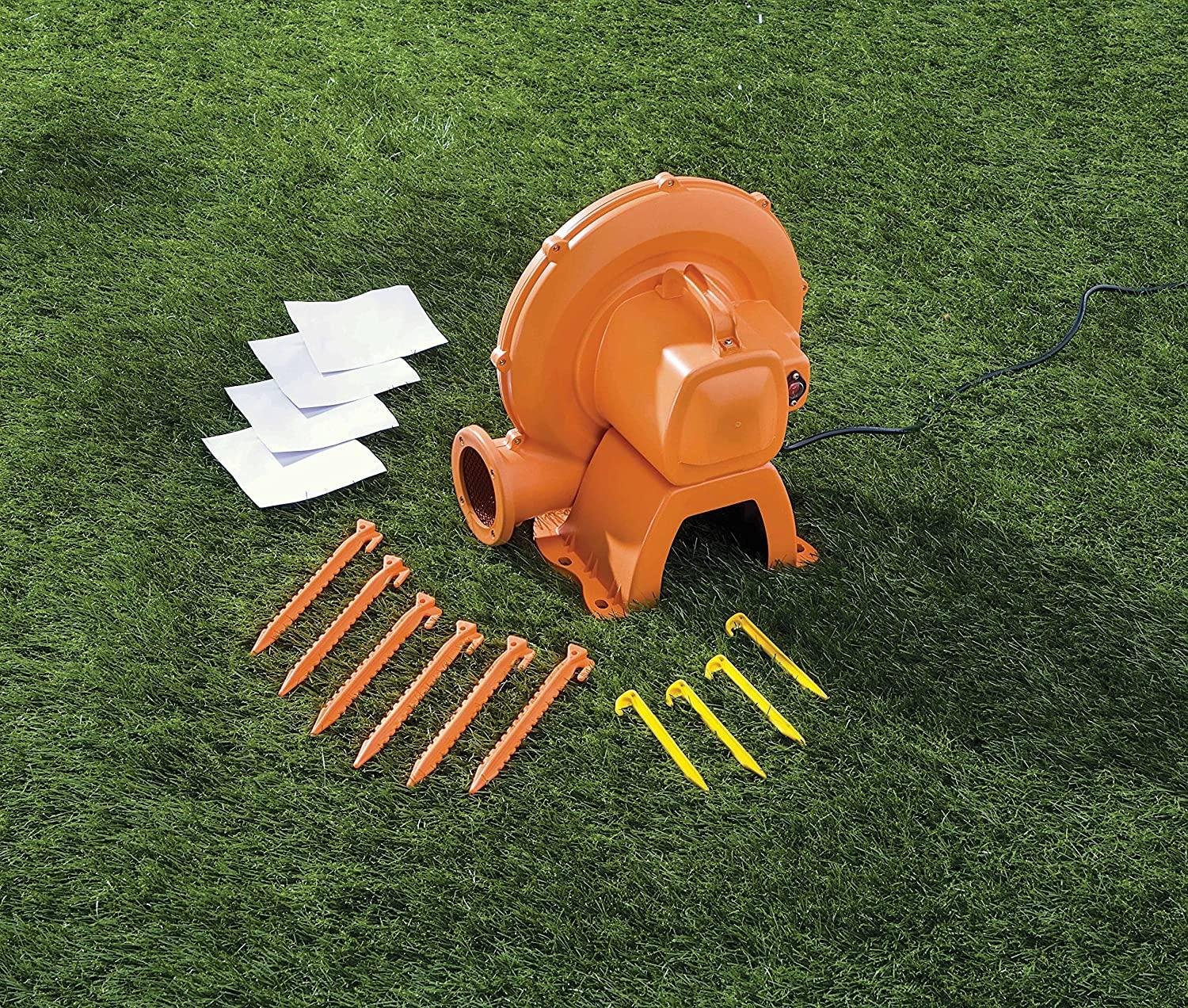 - Stakes anchor the bouncer firmly in place, while a heavy-duty blower provides continuous airflow