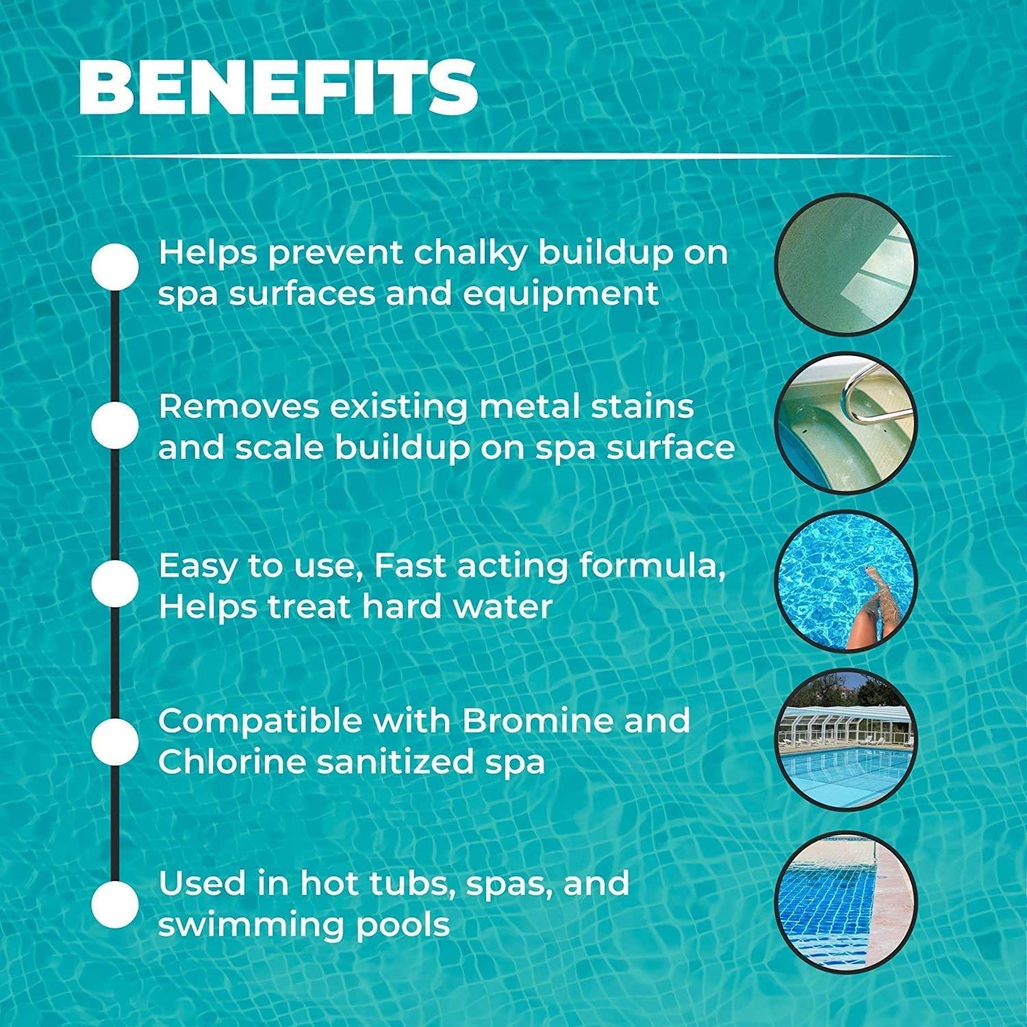 • Spa Stain And Scale Control For Hot Tubs: Control stain and scale deposits with our Professional Grade Spa scale, metal, and stain control product. Spend your leisure time enjoying your hot tub instead of worrying about chalky build-up on spa equipment and surfaces.