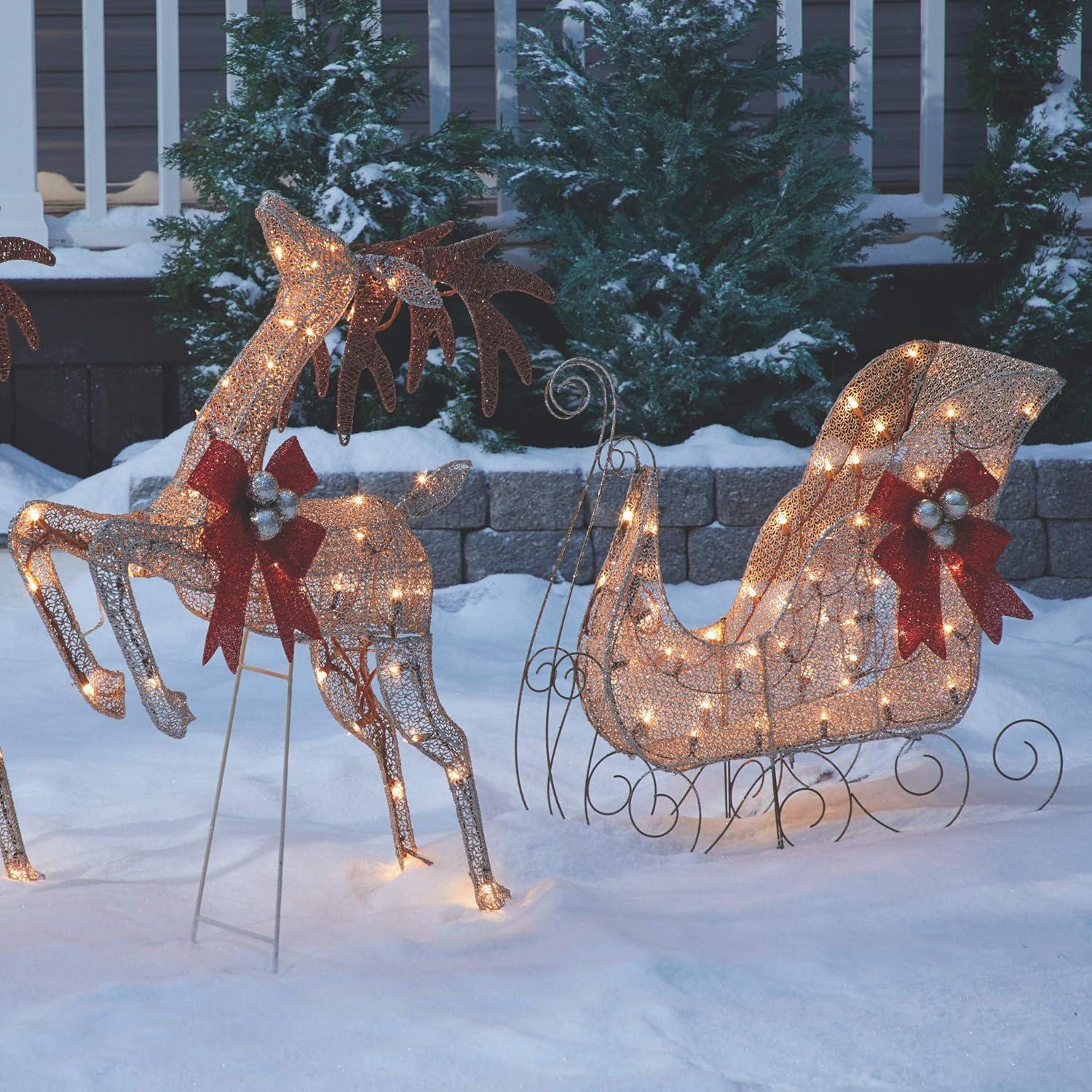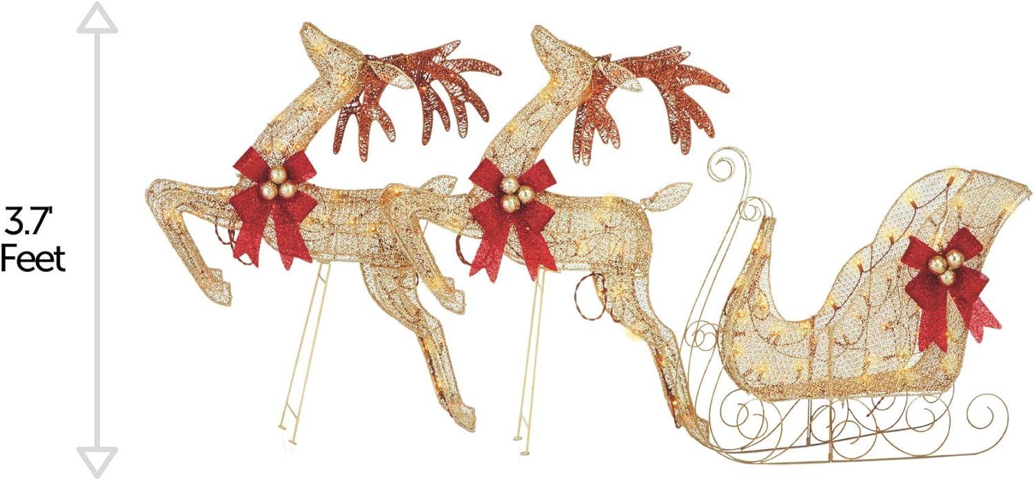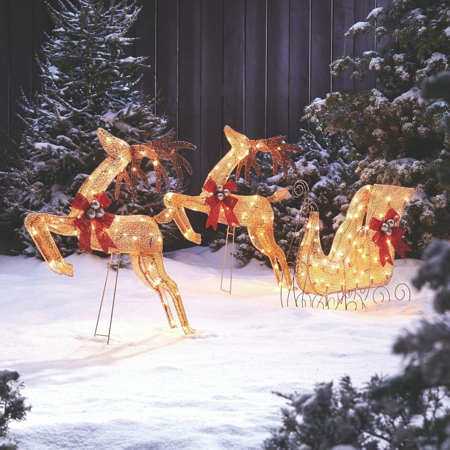NOMA Set of 3 Pre-Lit Light Up Glittering Golden Reindeer & Sleigh | Christmas Holiday Lawn Decoration | Indoor/Outdoor