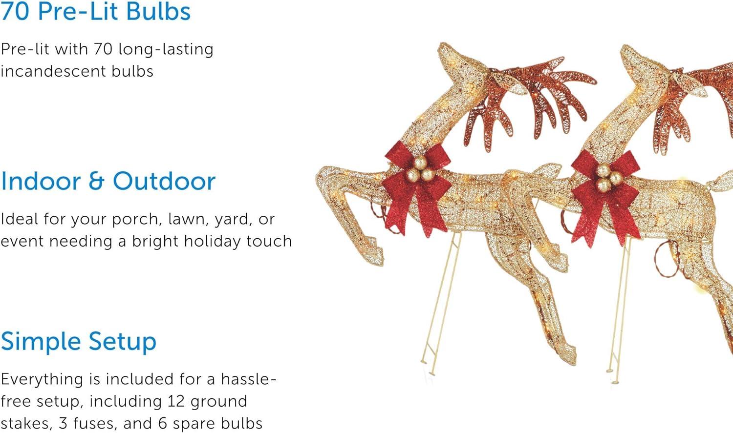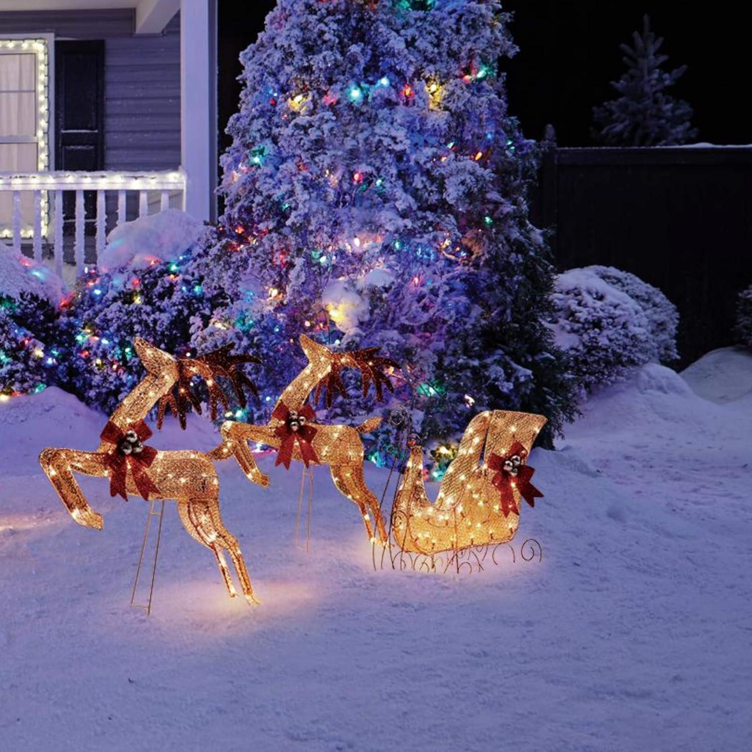 • PERFECT CHRISTMAS GREETING: Make holiday decorating easy with our 3-Pack 2 Golden Reindeer & Sleigh Set. Whether you are decorating for Christmas or another holiday, our Reindeer & Sleigh Set will give your family and friends the perfect greeting this holiday season.