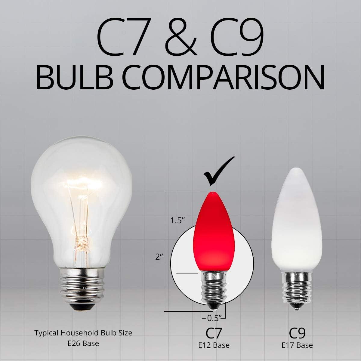 - [ POLYCARBONATE LENSES, 200x STRONGER THAN GLASS ] Bulb walls as thick as two typical Christmas bulbs, exceptionally durable. More importantly, the bulb thickness enables the vivid color that recreates the look of vintage ceramic bulbs. REMOVABLE AND REPLACEABLE bulbs (replacement bulbs sold separately). If one bulb goes out the rest stay lit. Colors will never fade, chip or crack. Bulbs rated to 60,000 hours.